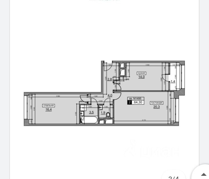 Общая площадь 63.4 м2