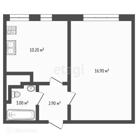 Квартира в черновой отделке, площадь квартиры составляет 33 кв.м., комната 16,9 кв.м., кухня 10,2 кв., прихожая 2,9 кв.м., санузел 3 кв.м.