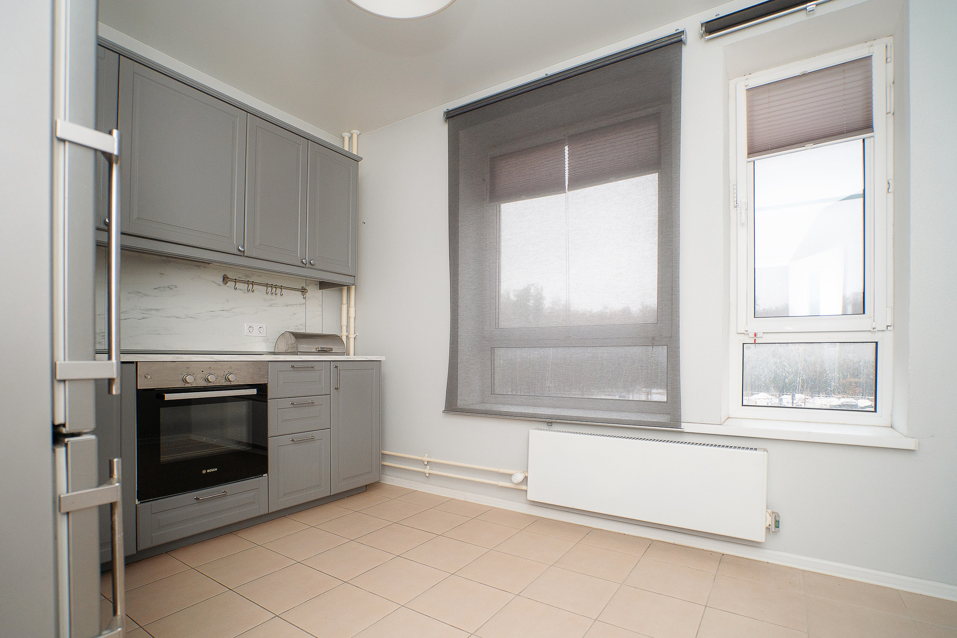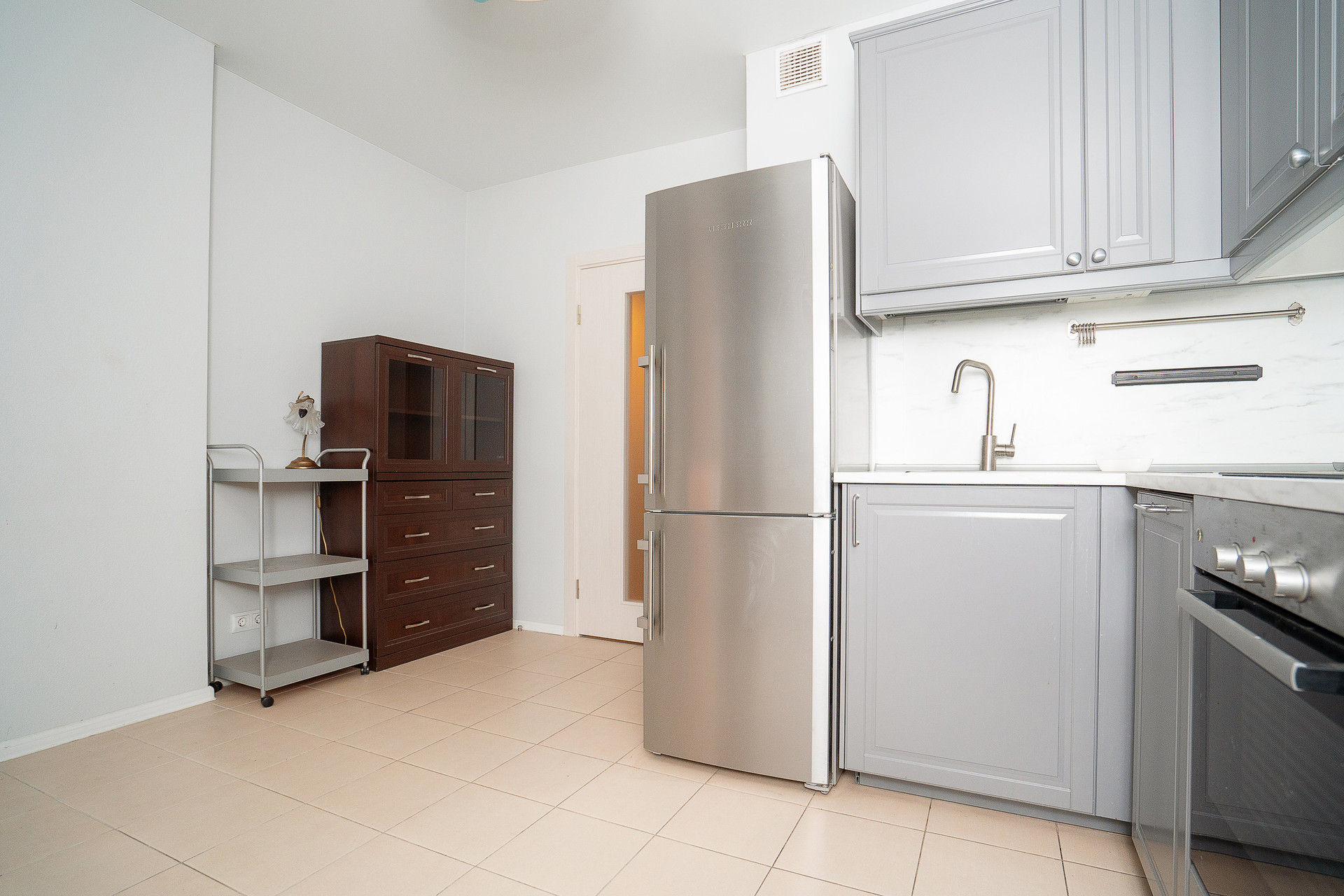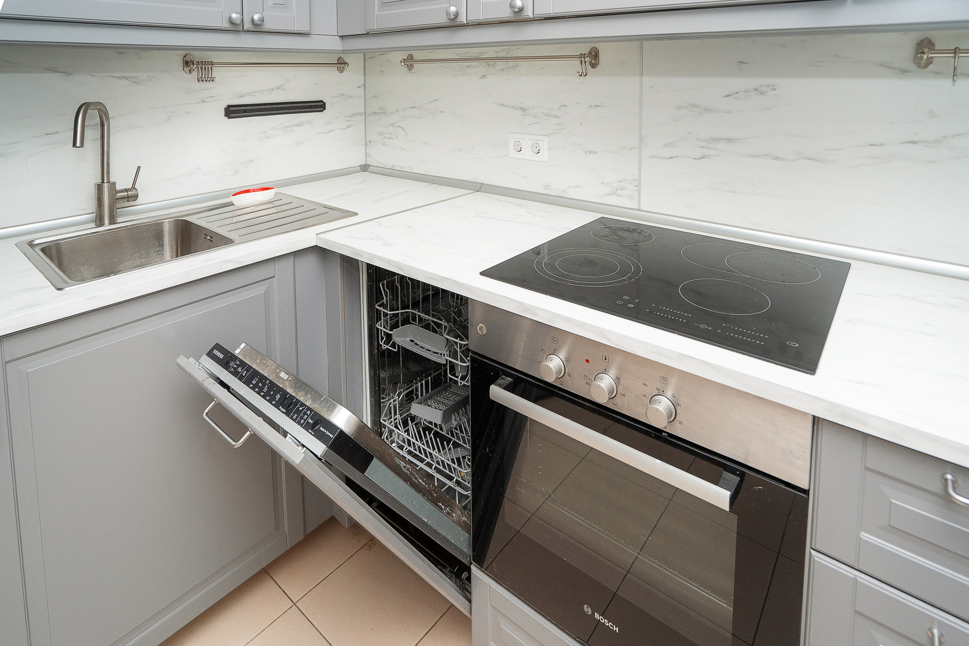 Квартира продается с мебелью и встроенной кухней с техникой, включая посудомоечную машину.