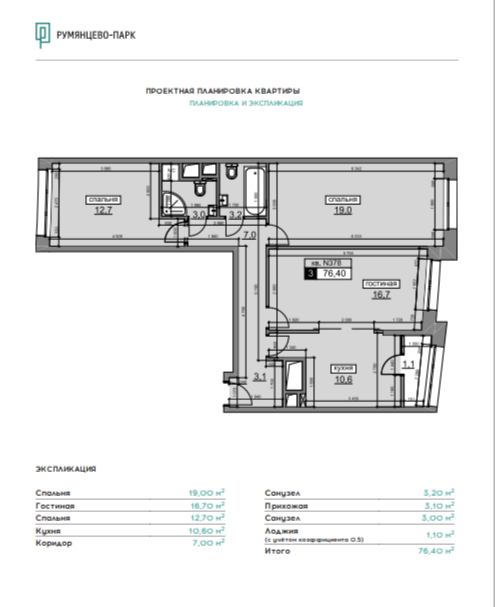 Продается отличная 3-х комнатная квартира в монолитном доме в ЖК "Румянцево-Парк", построенному в 2022 году по индивидуальному проекту, площадью (76,4 кв.м с лоджией), 75,1/48,4/10,6 кв. м., всего в 17 минутах ходьбы от метро Саларьево, выход№ 2.