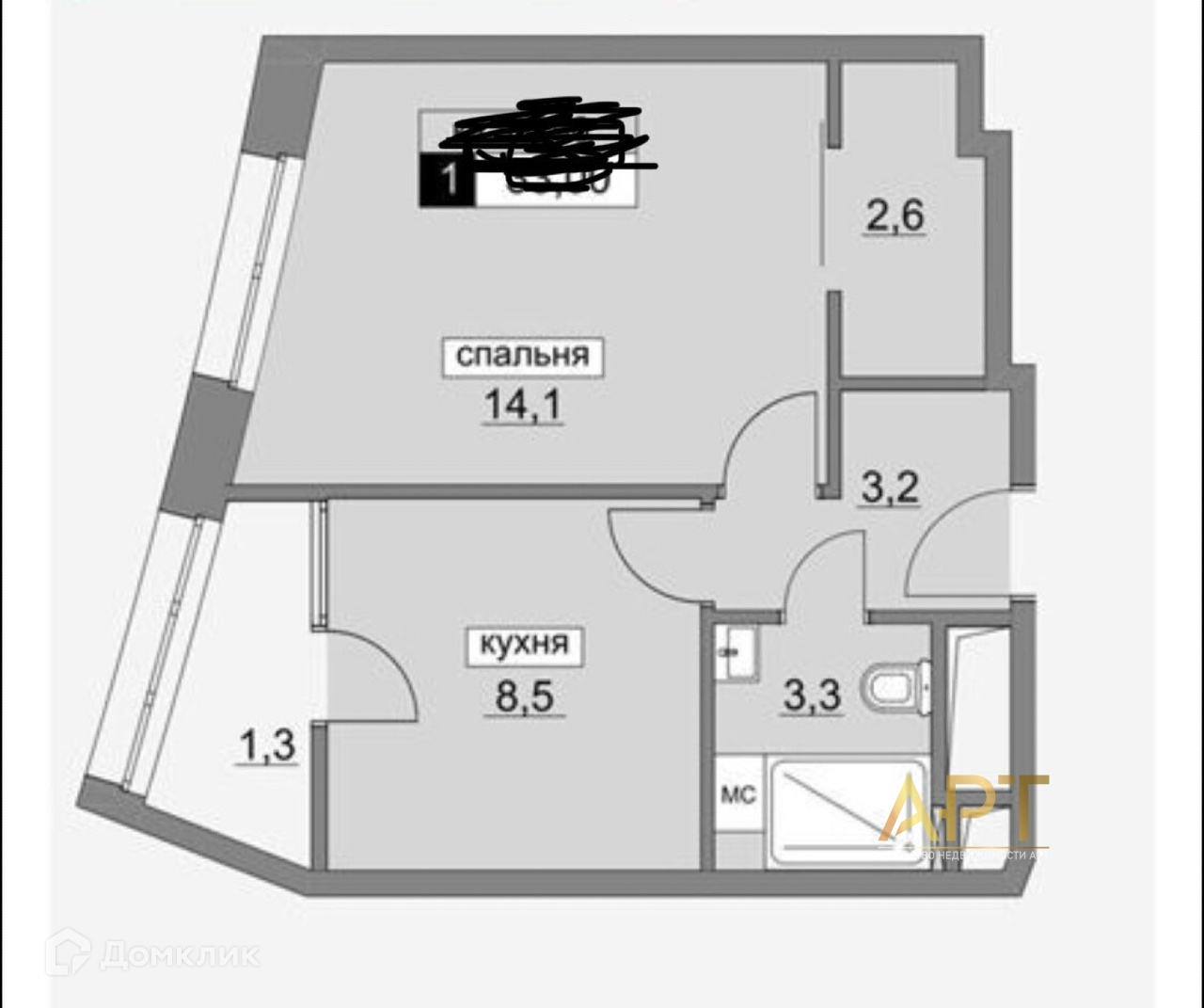 Жилая площадь 14.1 м2