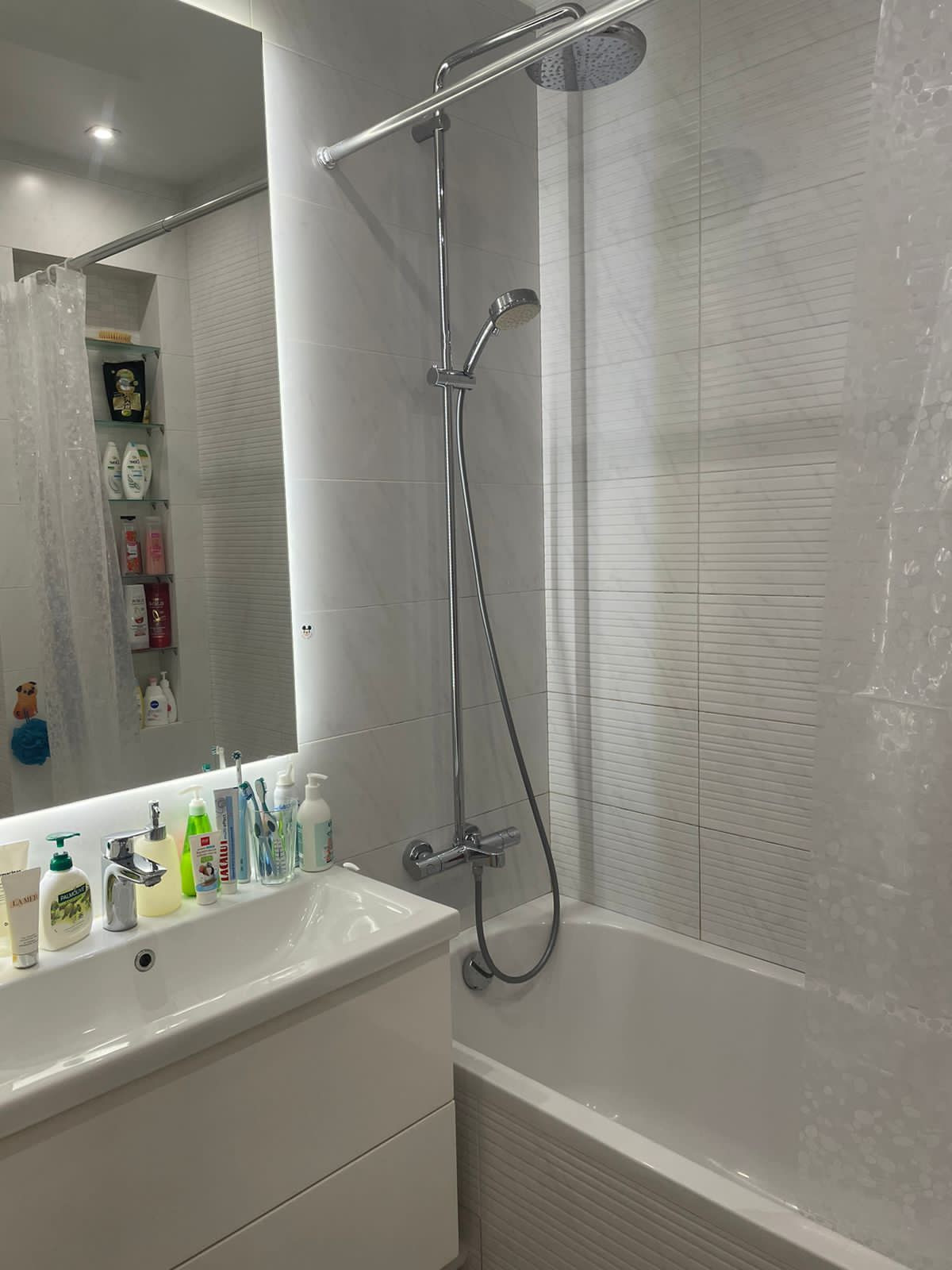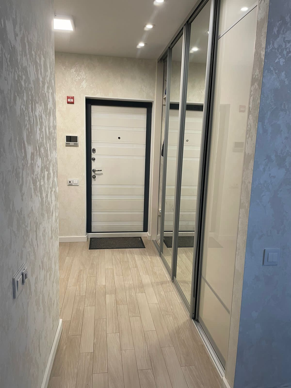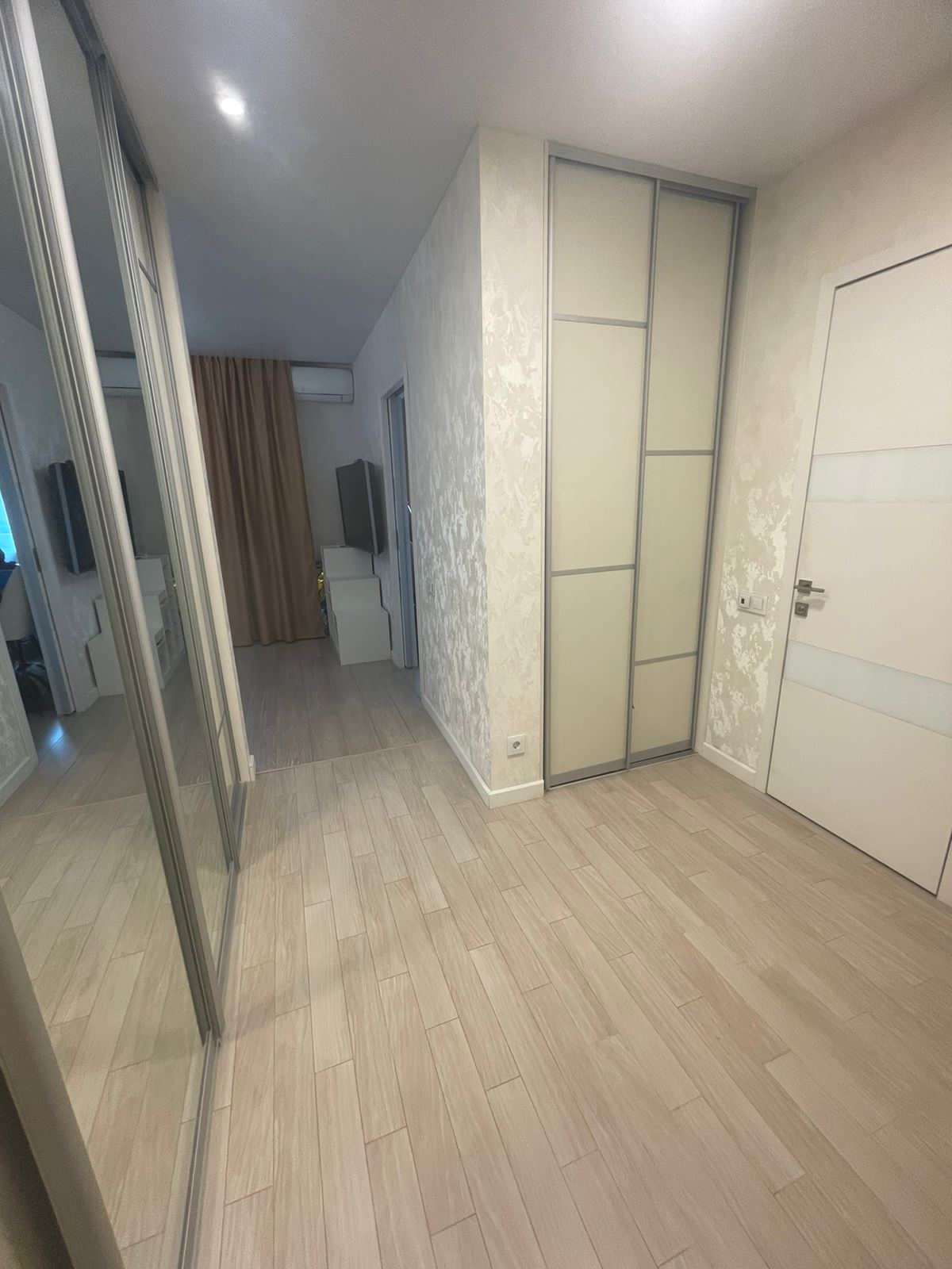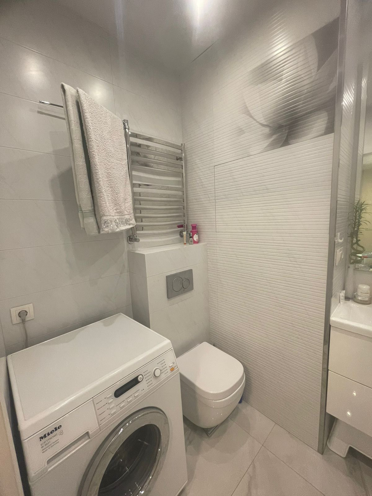 Совмещенный санузел, качественная плитка и сантехника (Grohe, Hansgrohe, Geberit) смесители Grohe, бойлер 30л на случай отключения горячей воды. Прихожая оборудована 2-мя вместительными встроенными шкафами.