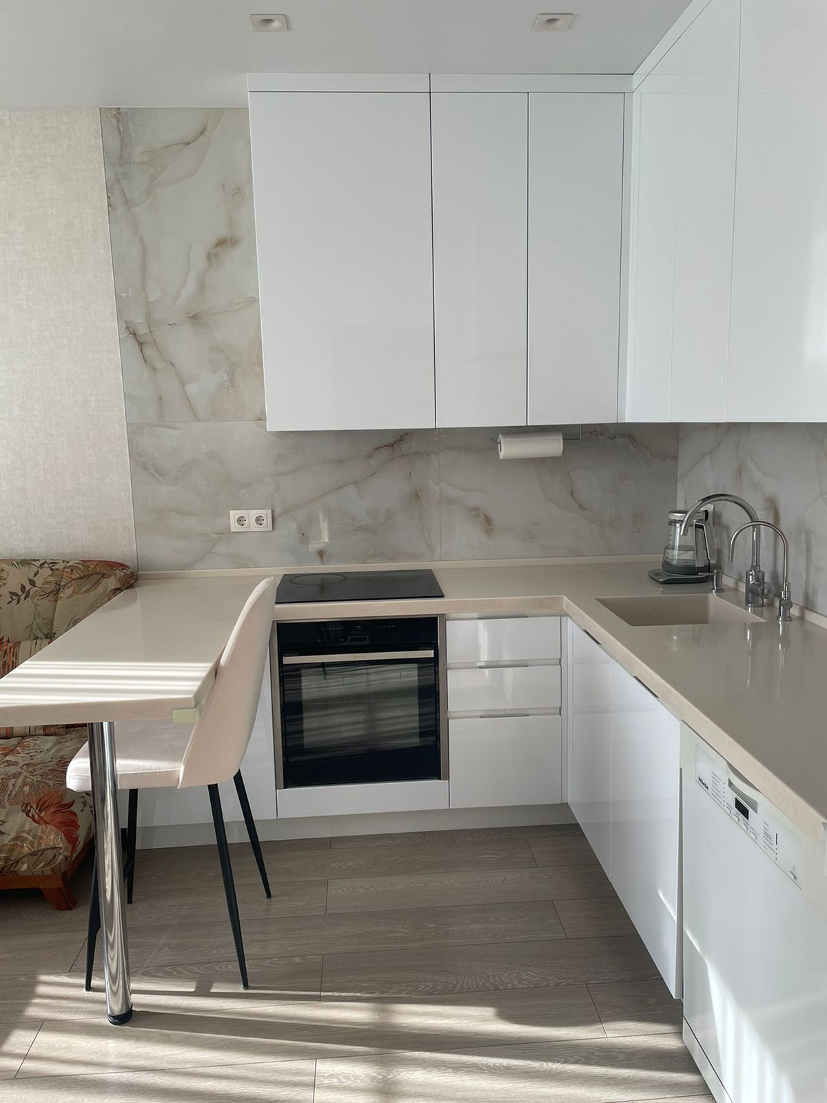 Большая кухня-гостиная со всей необходимой мебелью и техникой для комфортного проживания. Бытовая техника Neff, Libherr, Miele.