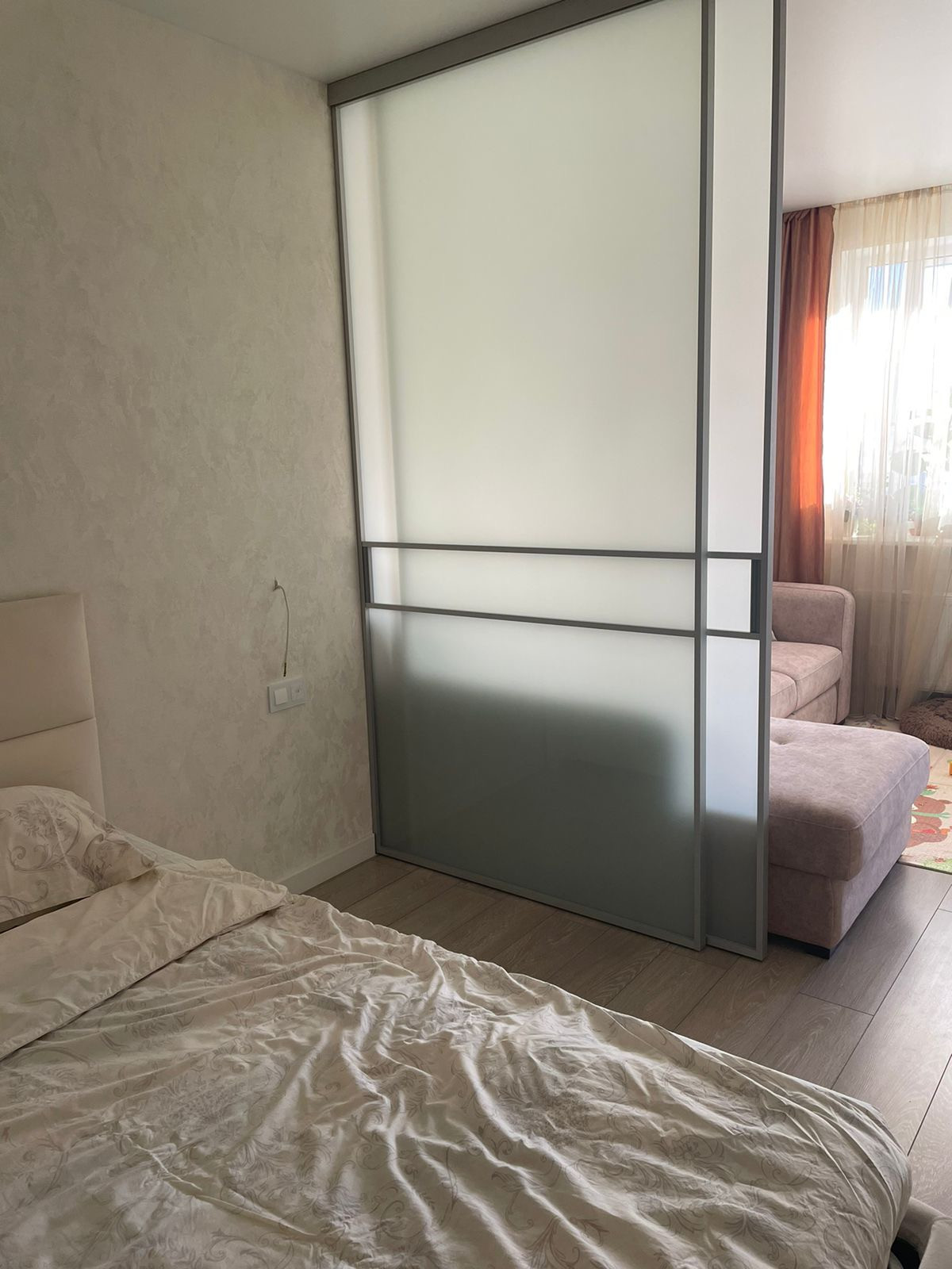 Просторная спальня с витражным остеклением .