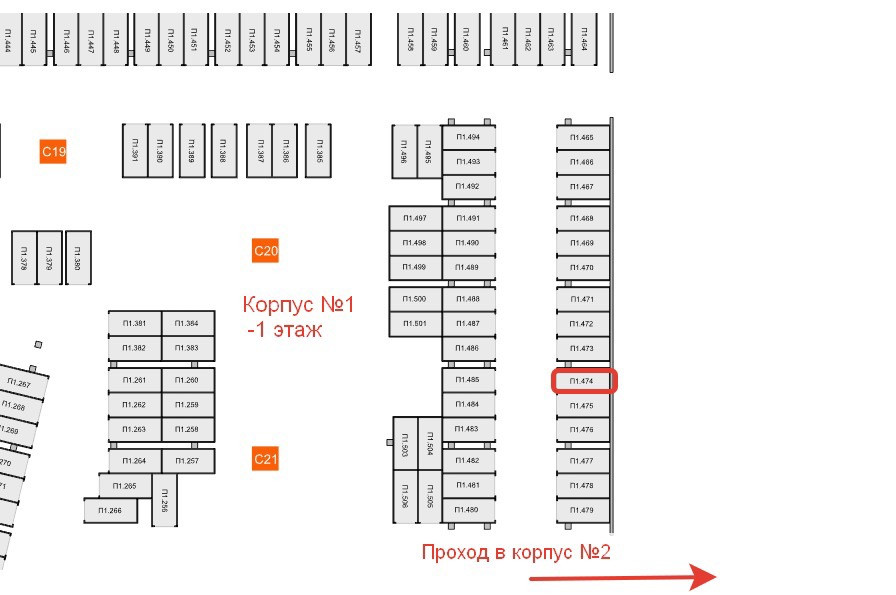 Машиноместо на -1 этаже, секции 19,20,21. Рядом проход в корпус 2. С одной стороны от места колонна. Со второй стороны место не занято. Выход на улицу в сторону ЖК Позитив.