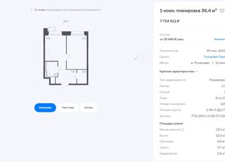 Однокомнатная квартира на продажу, 36.9 м2, многофункциональный комплекс Тропарёво Парк, к1.2