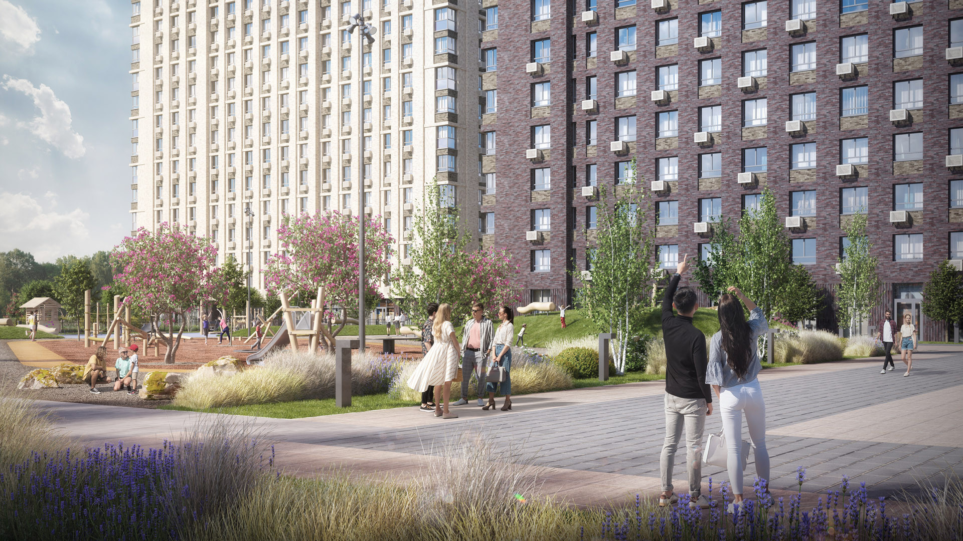 Жители комплекса смогут проводить время в благоустроенном внутреннем дворе, где продуманы места отдыха для жильцов разных возрастов: детские, спортивные площадки, батуты, площадки для настольного тенниса, пространство для спокойного отдыха и площадки для общения.