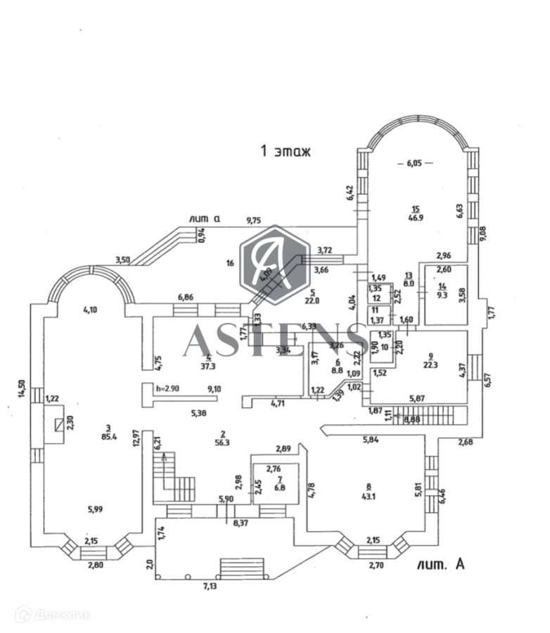 1 этаж: большая гостиная площадью 85,4 кв.м., столовая 37,3 кв.м., кухня 22 кв.м., жилая комната 43,1 кв.м., комната с бассейном 44,9 кв.м. с санузлом, душевой и сауной. + большая терраса.