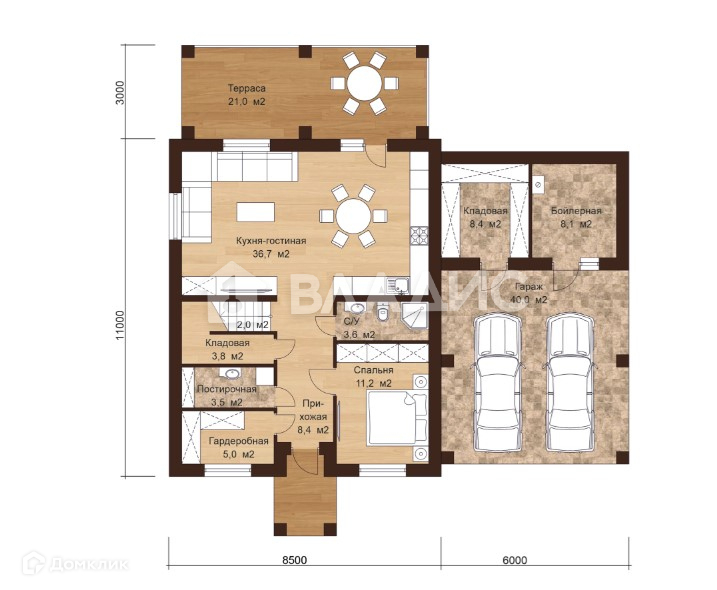 Планировка дома предусматривает просторную гостиную совмещённую с кухней.