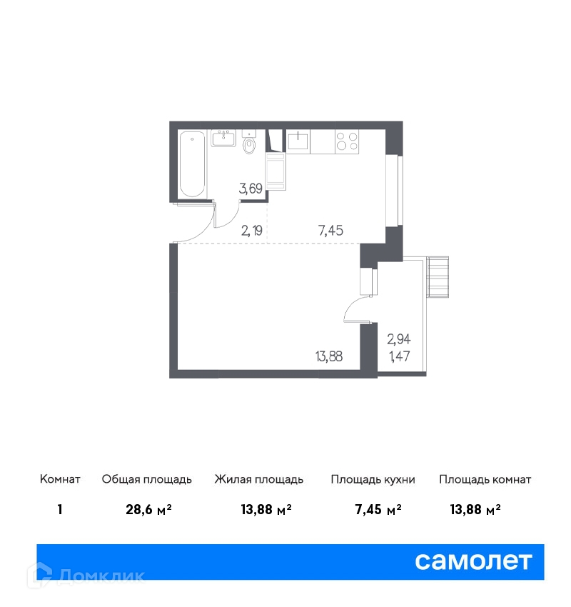 Общая площадь 28.6 м2