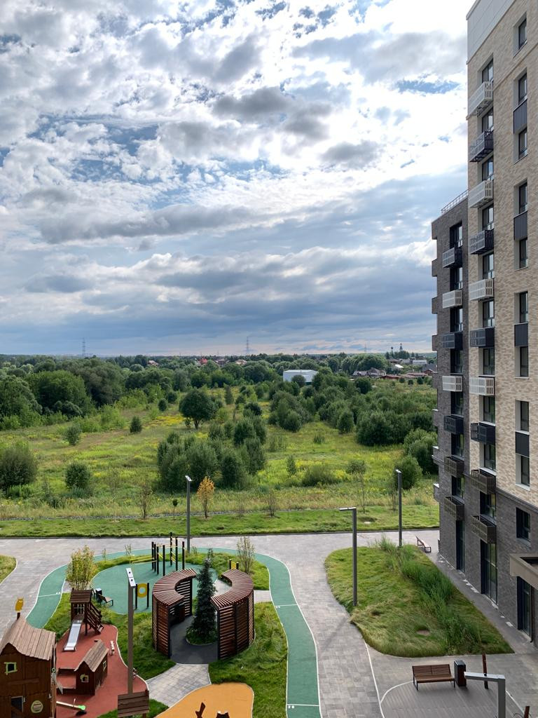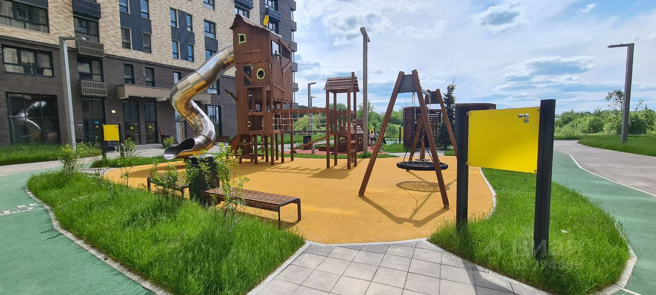 Вокруг дома много зелени, есть скамейки, спортивная и детская площадки, парковка.