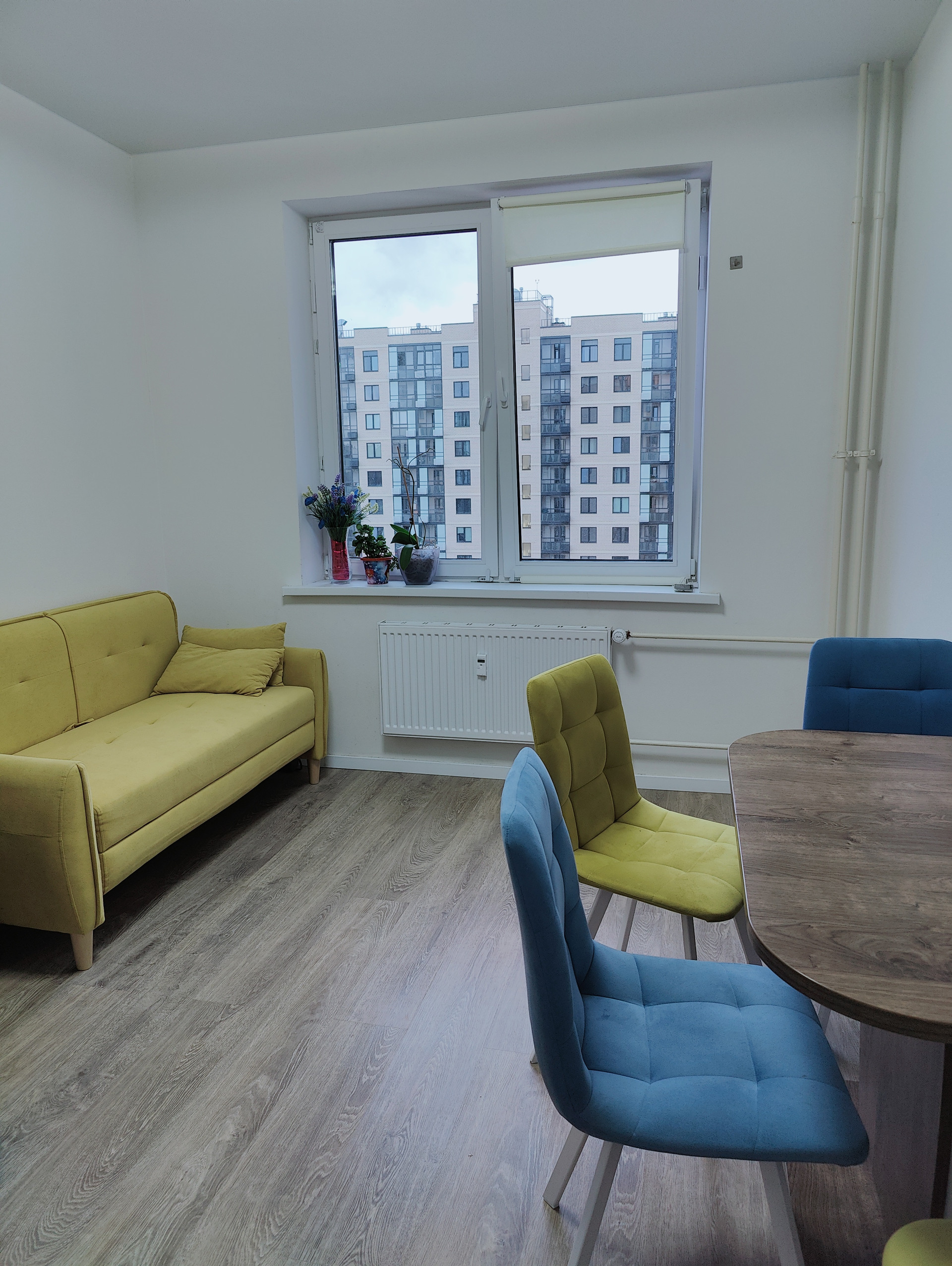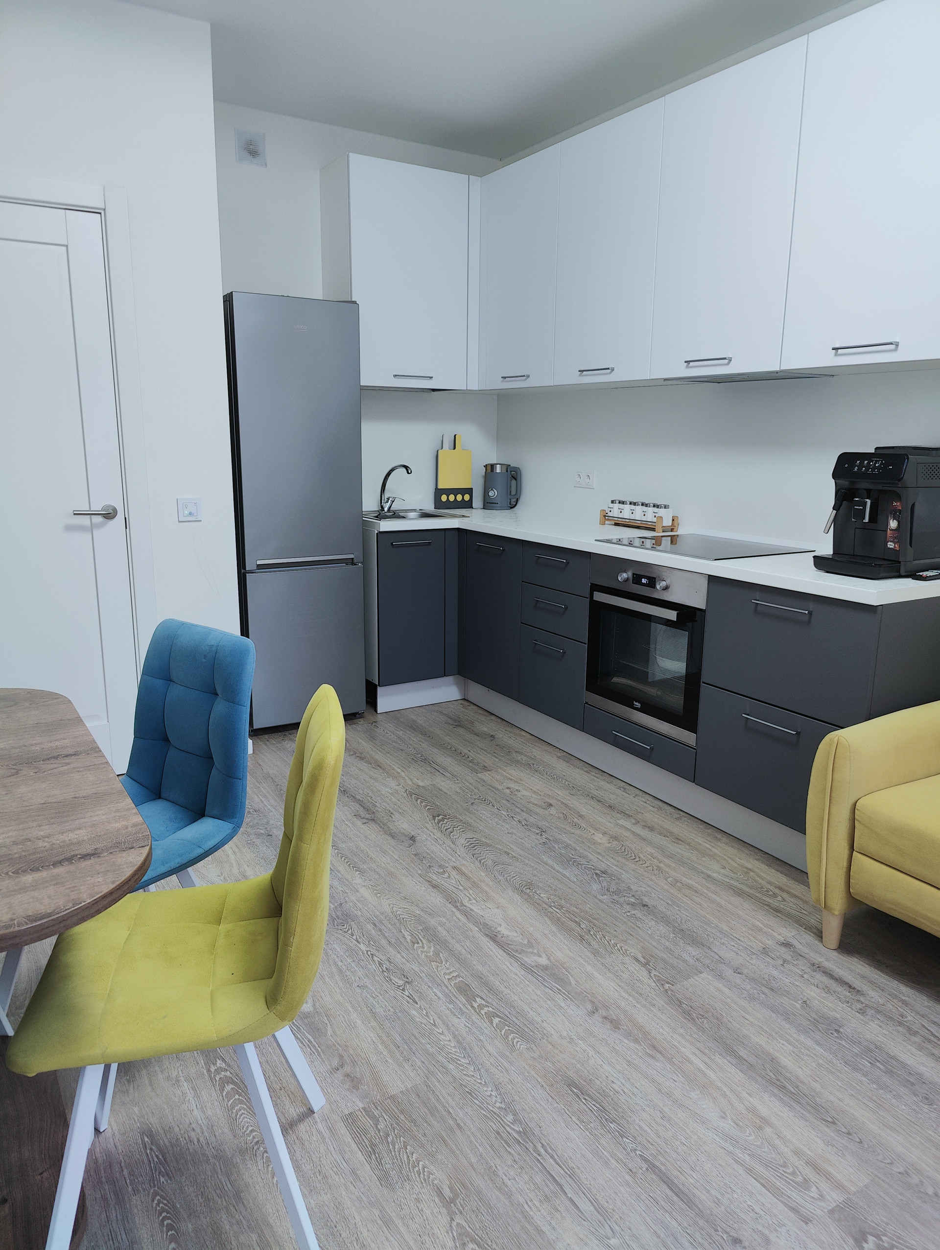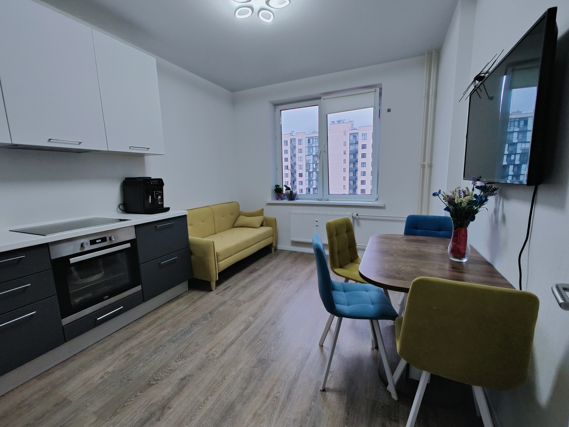 В кухне-гостиной (13,2 кв.м.) установлена  кухня с варочной панелью, большой стол для семейных обедов и уютный диванчик для вечерних посиделок, комната (12,9 кв.м.) с выходом на лоджию. Окна выходят в зеленый и уютный двор. Квартира оборудована системой умный дом.