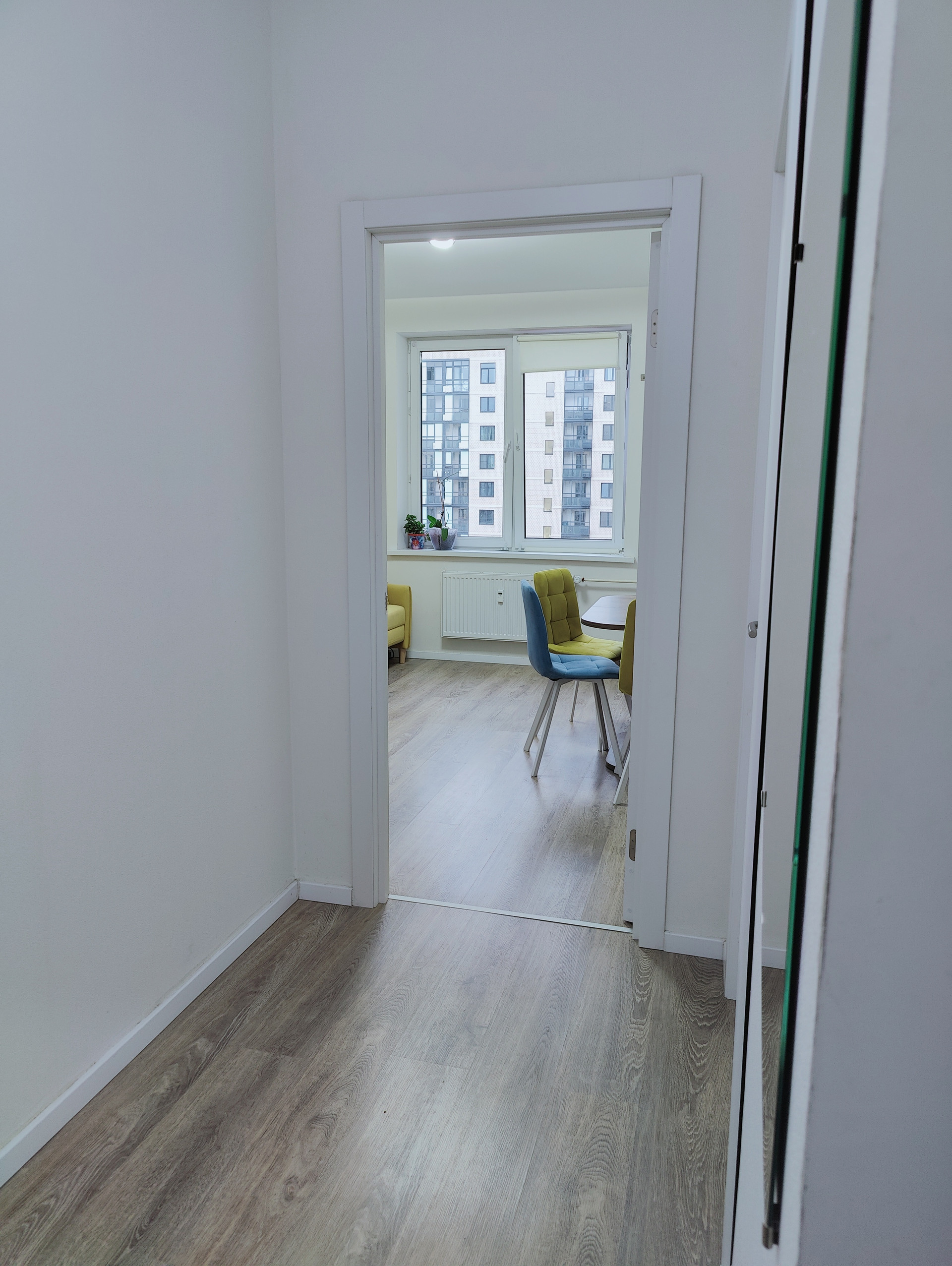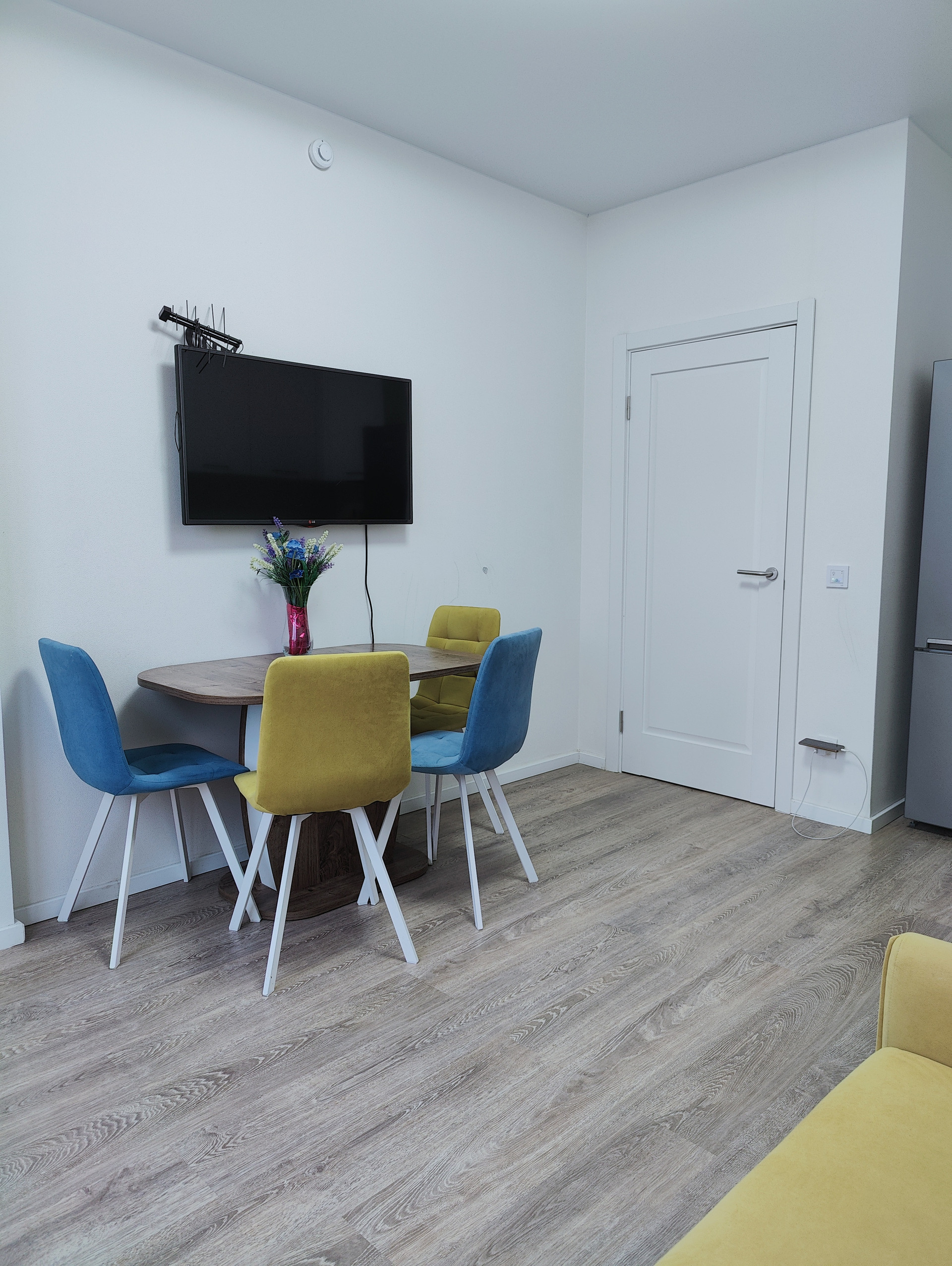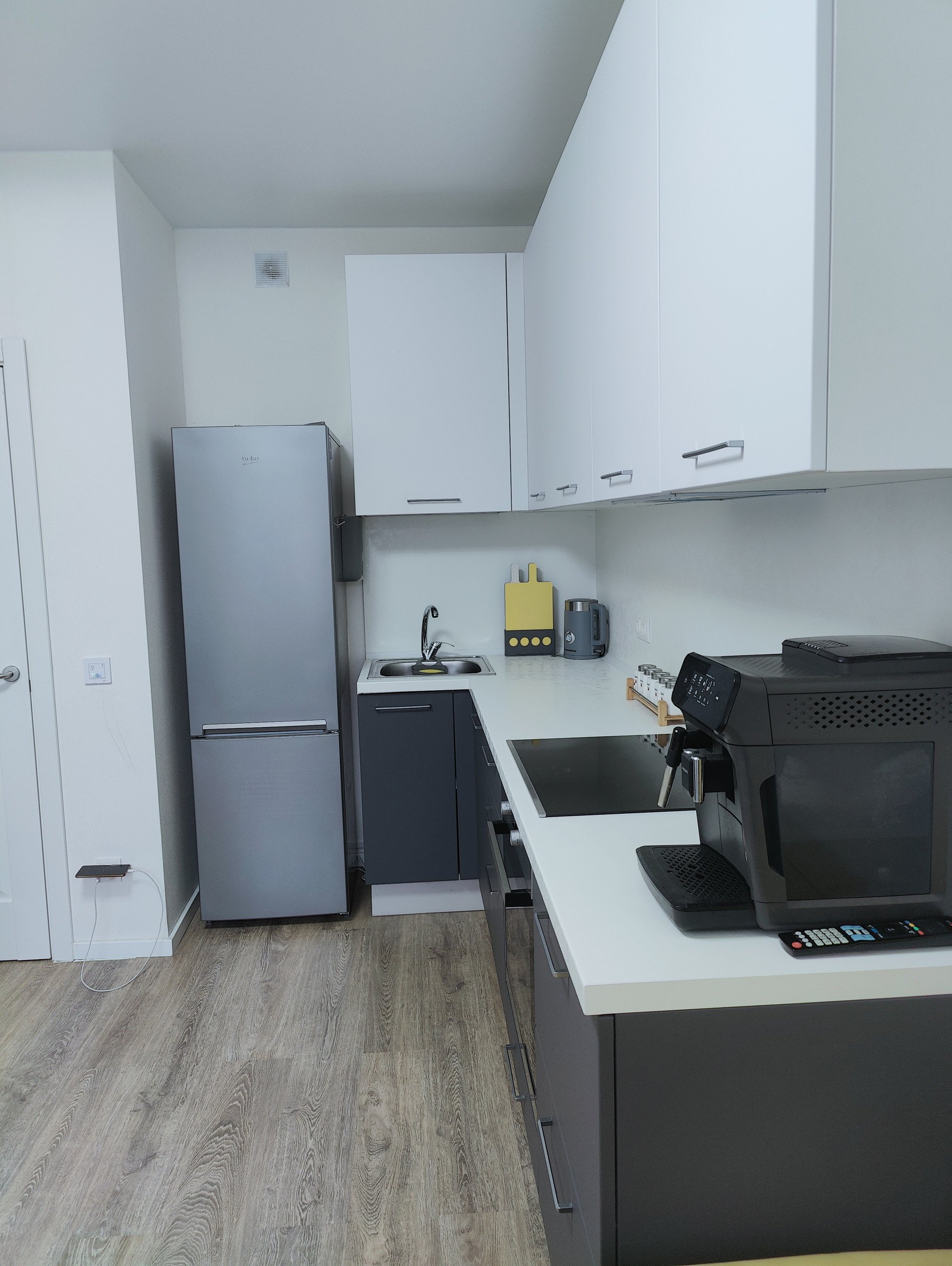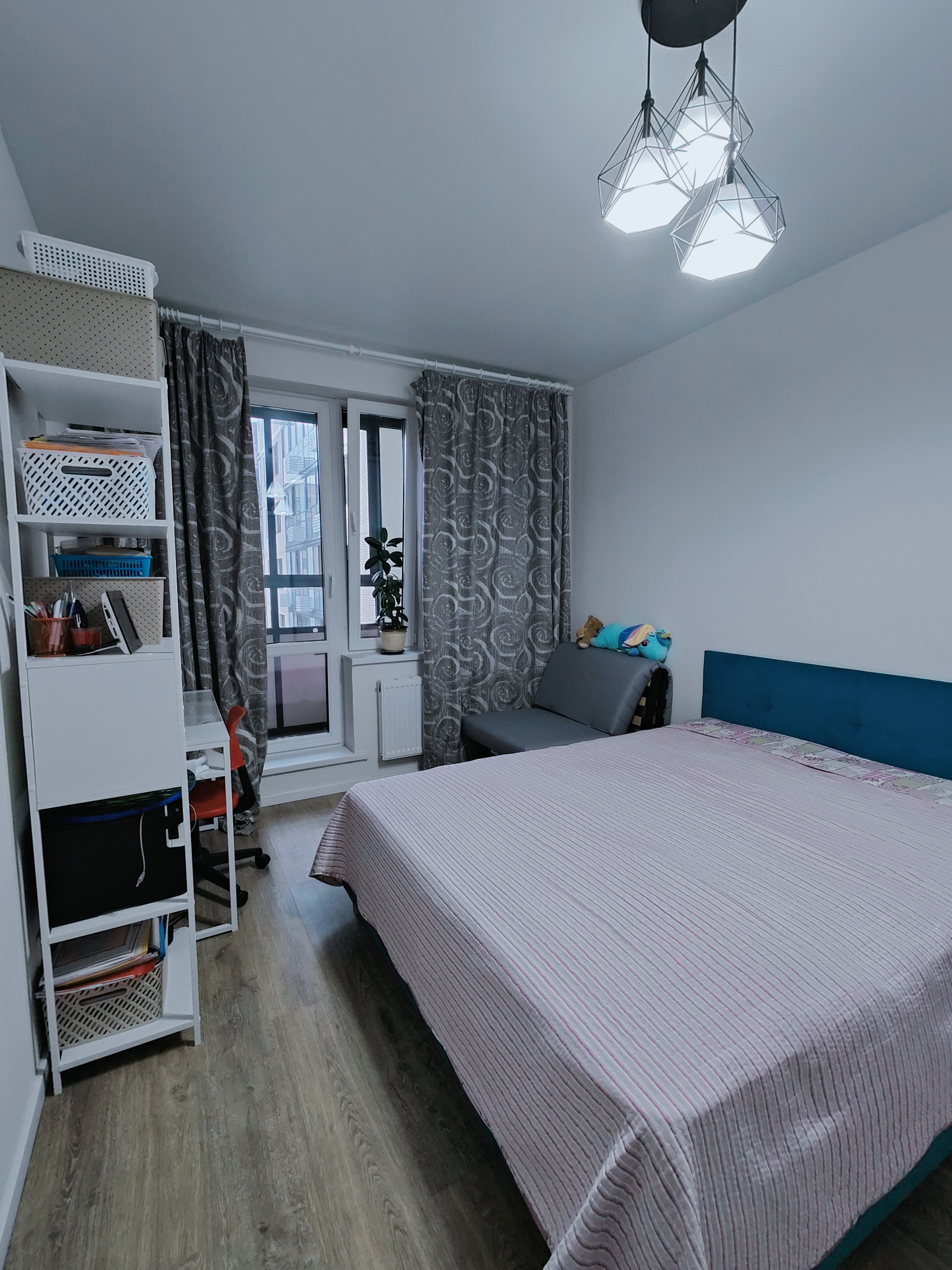 В кухне-гостиной (13,2 кв.м.) установлена  кухня с варочной панелью, большой стол для семейных обедов и уютный диванчик для вечерних посиделок, комната (12,9 кв.м.) с выходом на лоджию. Окна выходят в зеленый и уютный двор. Квартира оборудована системой умный дом.
