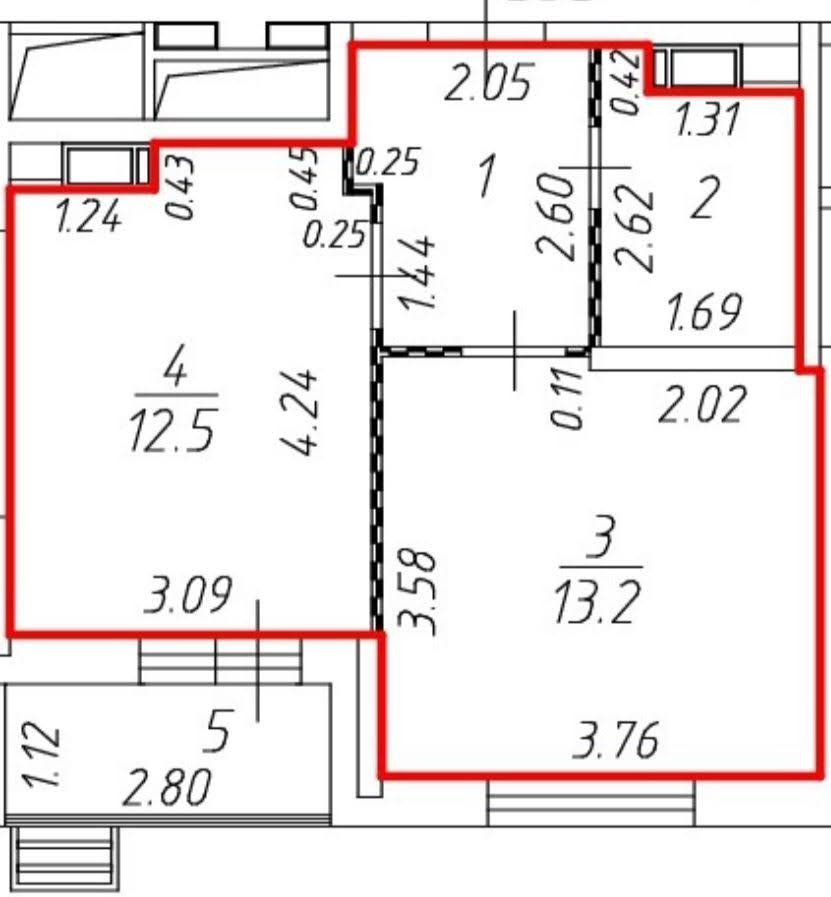 Комната 13,2 м2, кухня-гостиная 12,5 м2, застекленная лоджия 2,6 м2. Просторный коридор 4,8 м2. Площадь с учетом лоджии 36,53 м2.