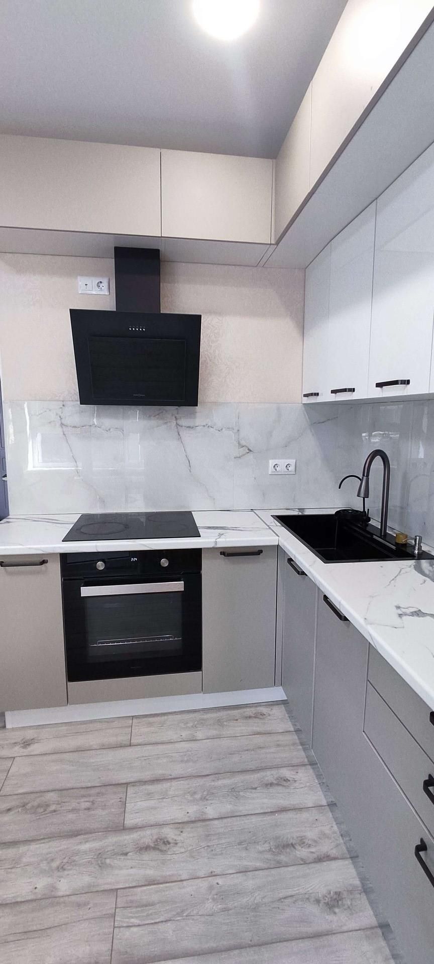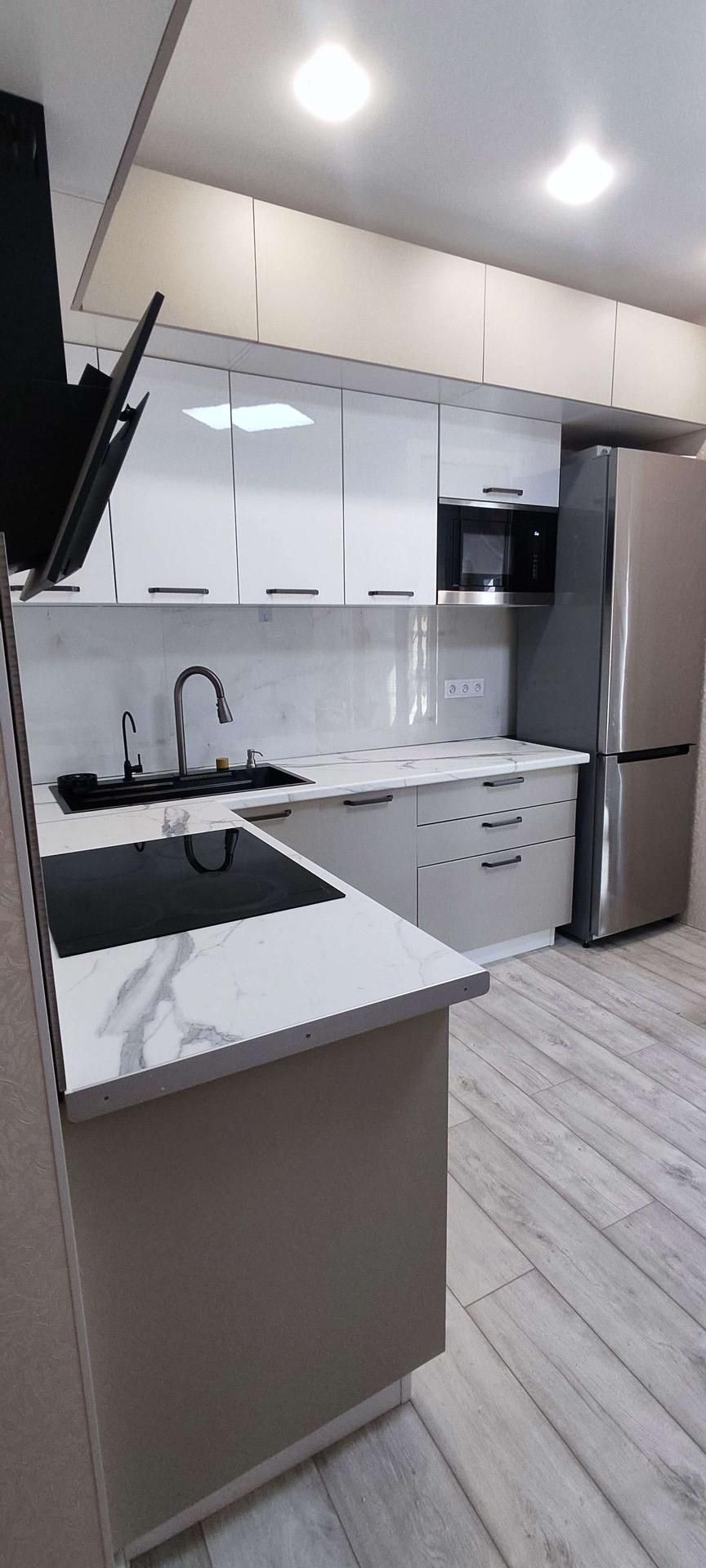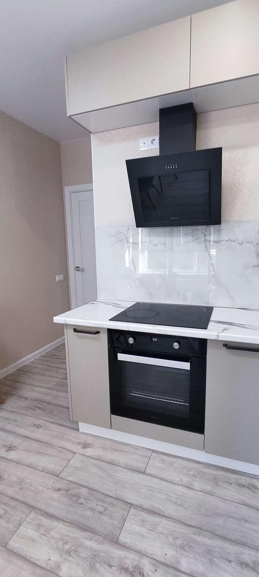 Встроенная кухня оборудована новой техникой: духовка, вытяжка, СВЧ, стеклокерамическая варочная поверхность, и холодильник. Вся техника остаётся будущим владельцам.