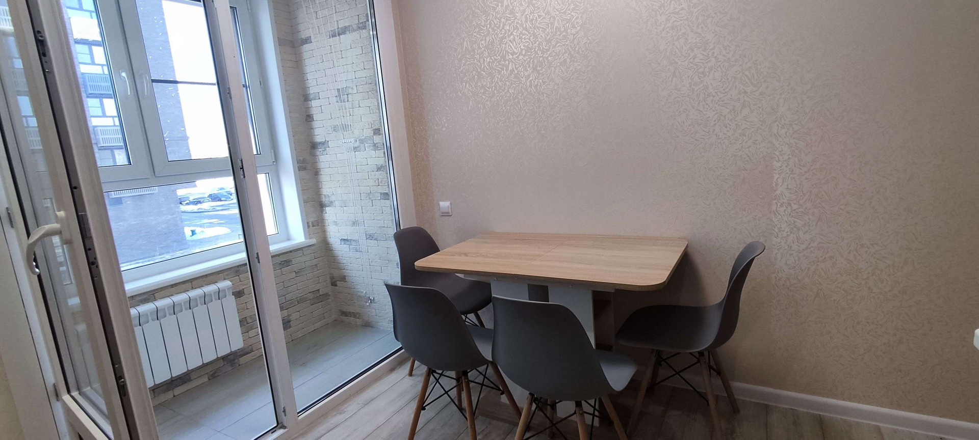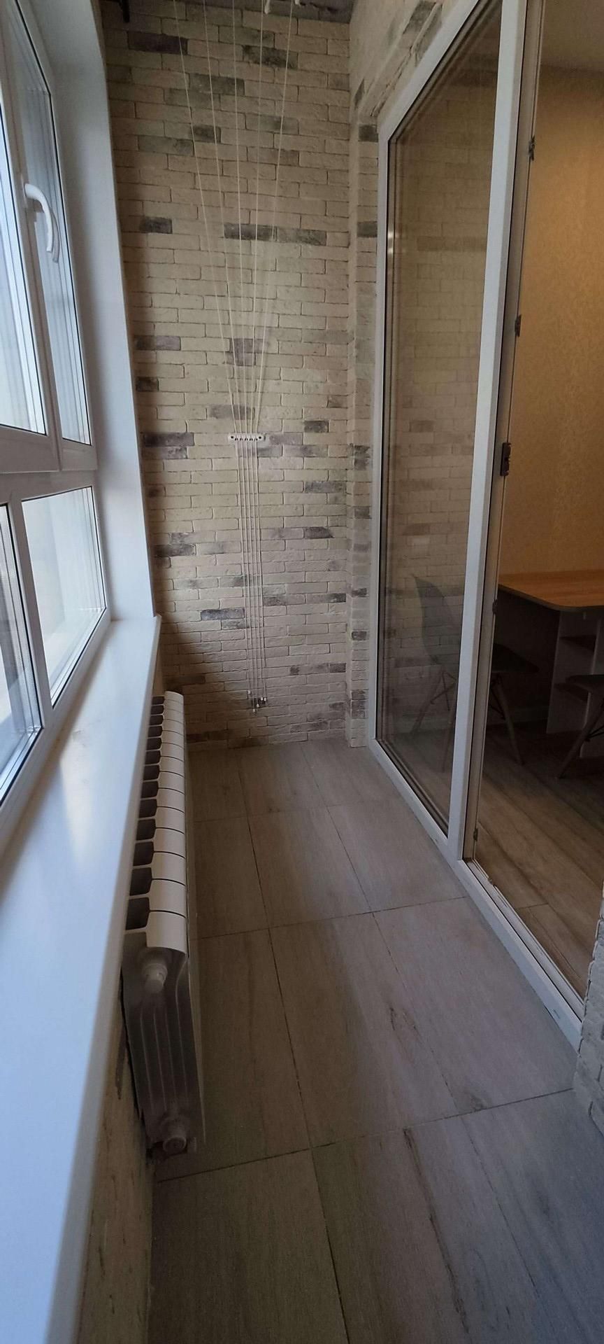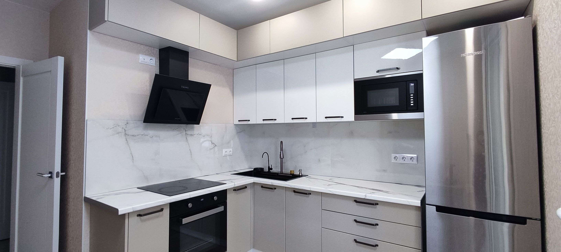 Встроенная кухня оборудована новой техникой: духовка, вытяжка, СВЧ, стеклокерамическая варочная поверхность, и холодильник. Вся техника остаётся будущим владельцам.