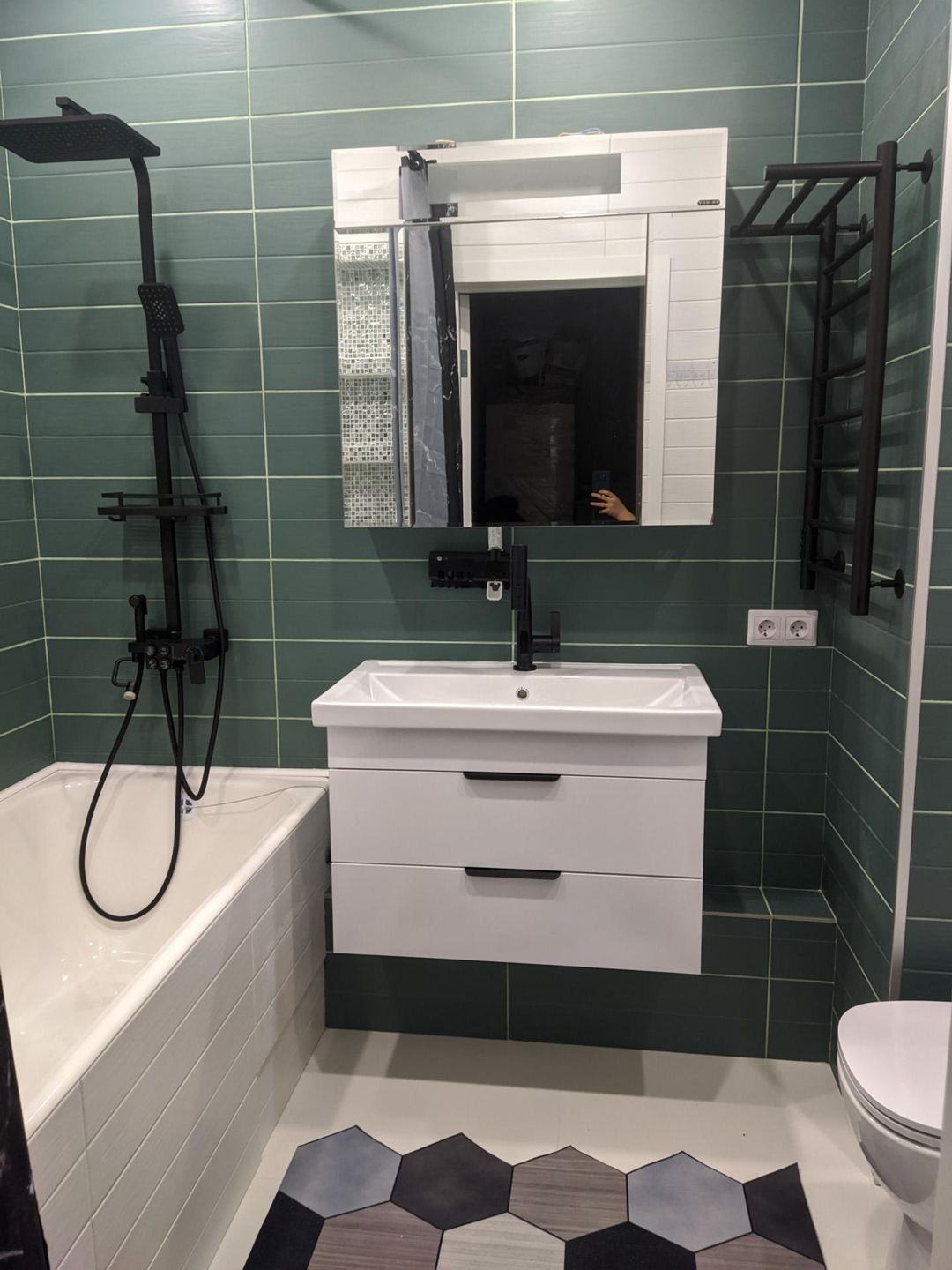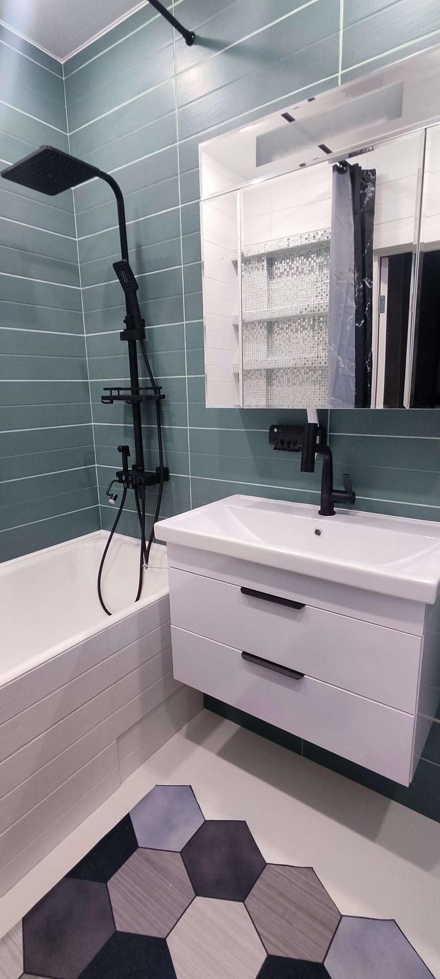 В санузле продумана каждая мелочь: чугунная ванна, современные смесители и стиральная машина для вашего уюта.