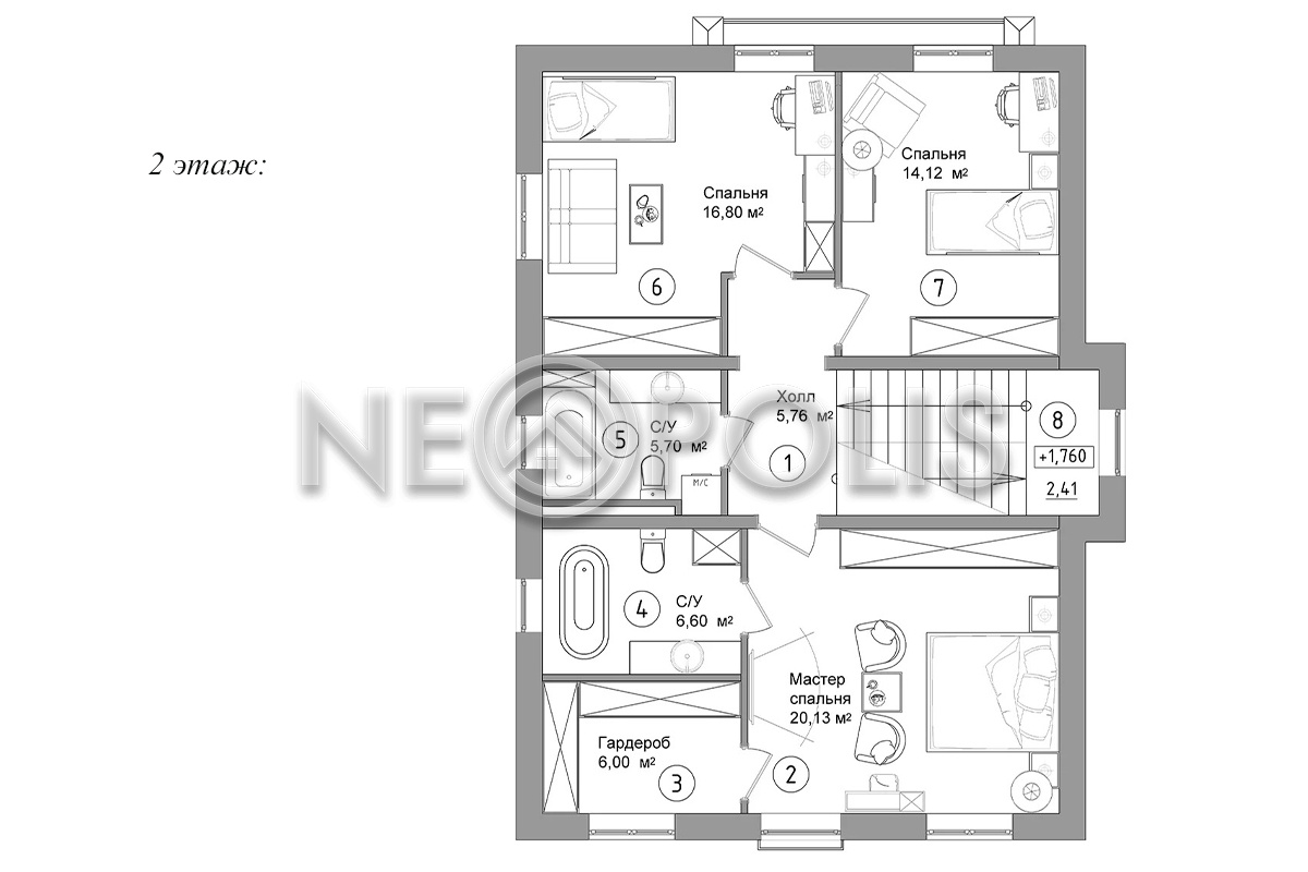 2 этаж: холл, мастер спальня с гардеробной и ванной комнатой, 2 спальни, санузел.