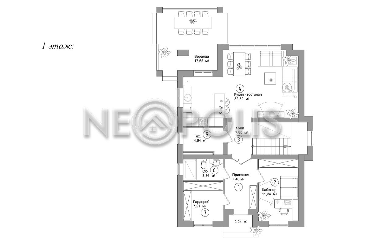 1 этаж: прихожая, холл, кухня-столовая, гостиная с камином и выходом на террасу с зоной барбекю, кабинет, гардеробная, санузел, кладовая, техническое помещение.
