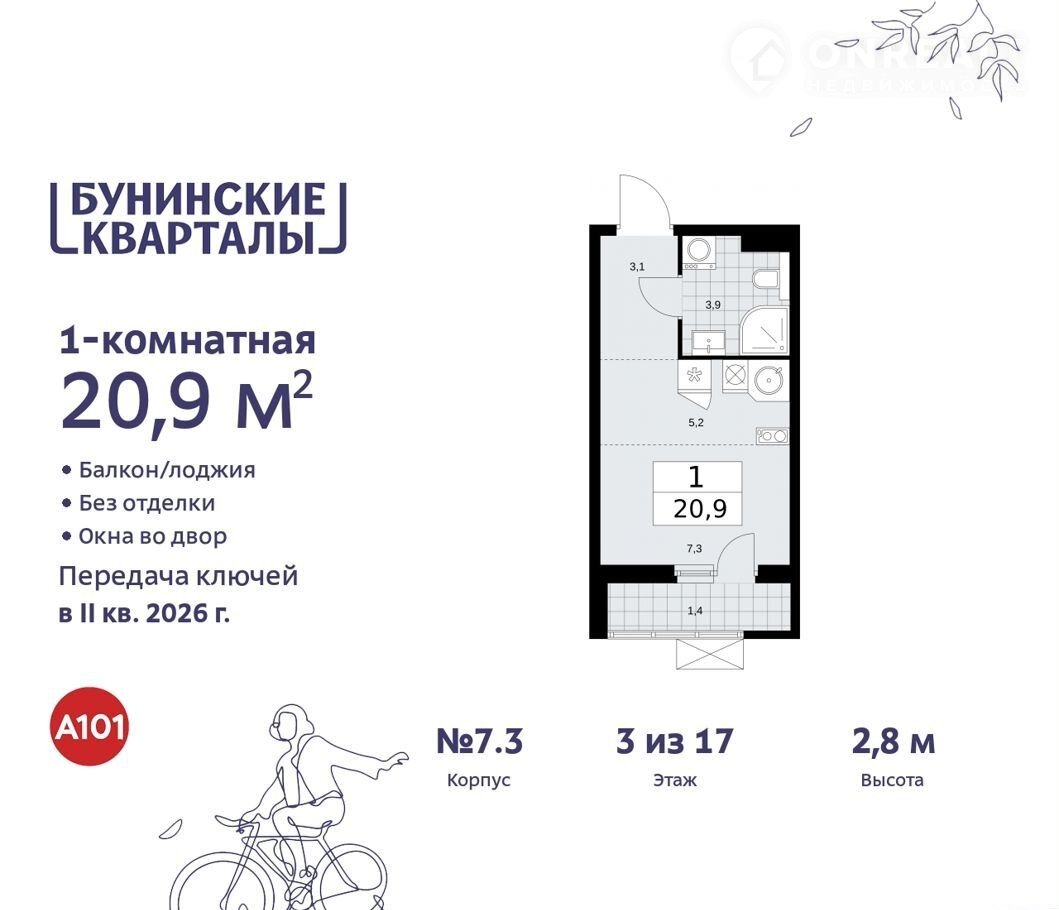 Квартира студия, 20.9 м2, этаж 3 / 17, на продажу в поселении Сосенском, жилой комплекс Бунинские Кварталы, 5.2