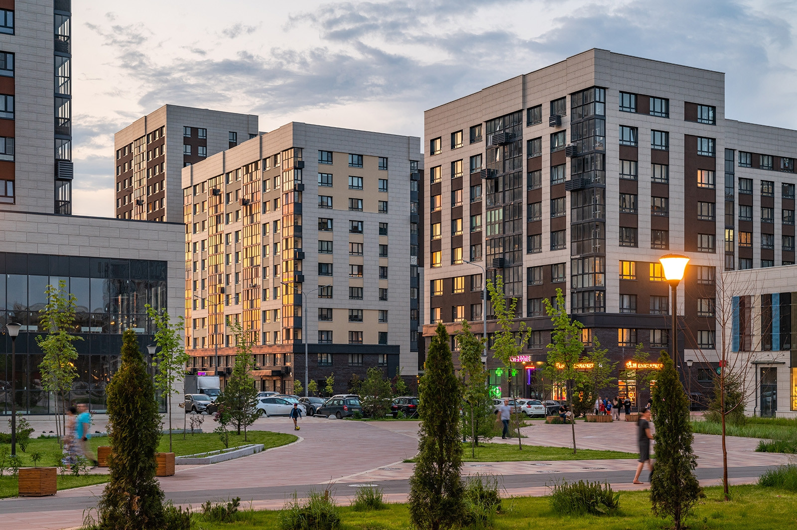 Спортивные и детские площадки, велодорожки, скверы.