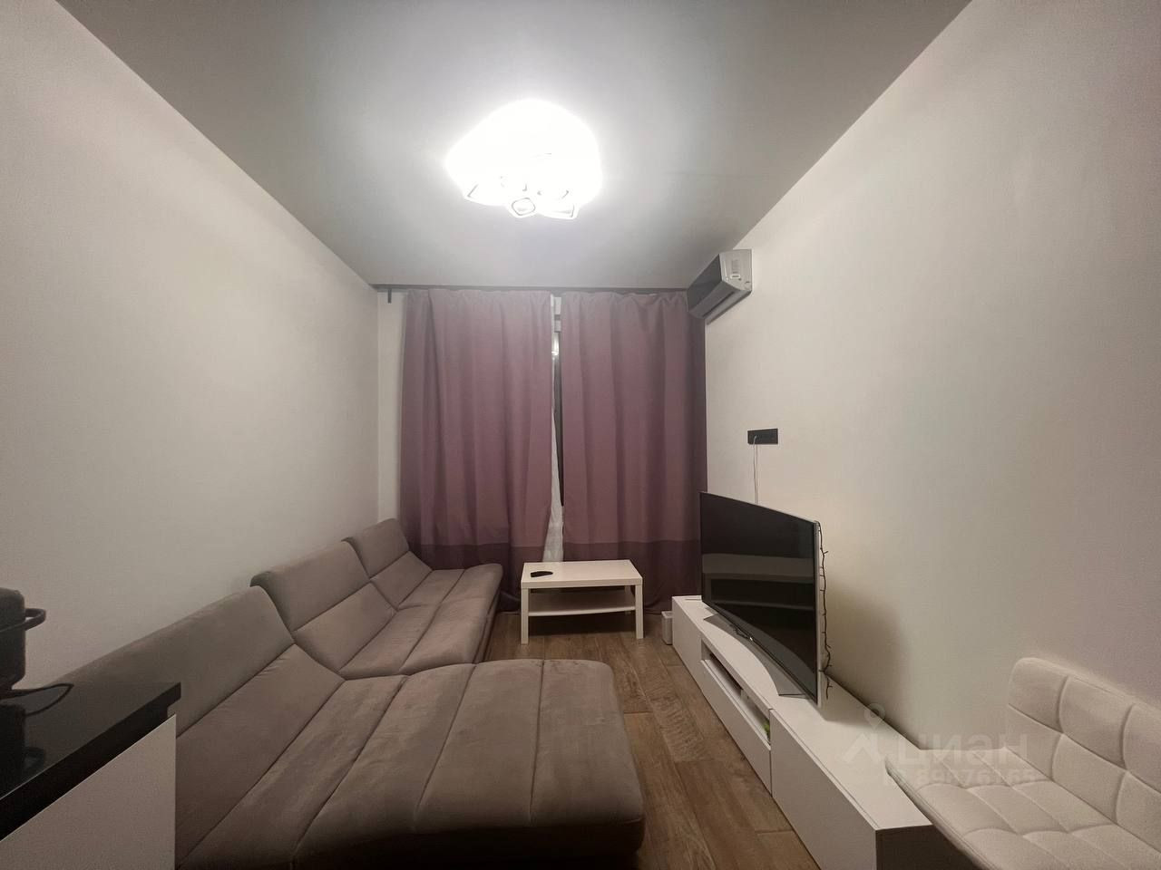 Остается мебель: встроенные шкафы, кухонный гарнитур с техникой, диван, кровать (с дополнительным местом хранения), тумба под телевизор.