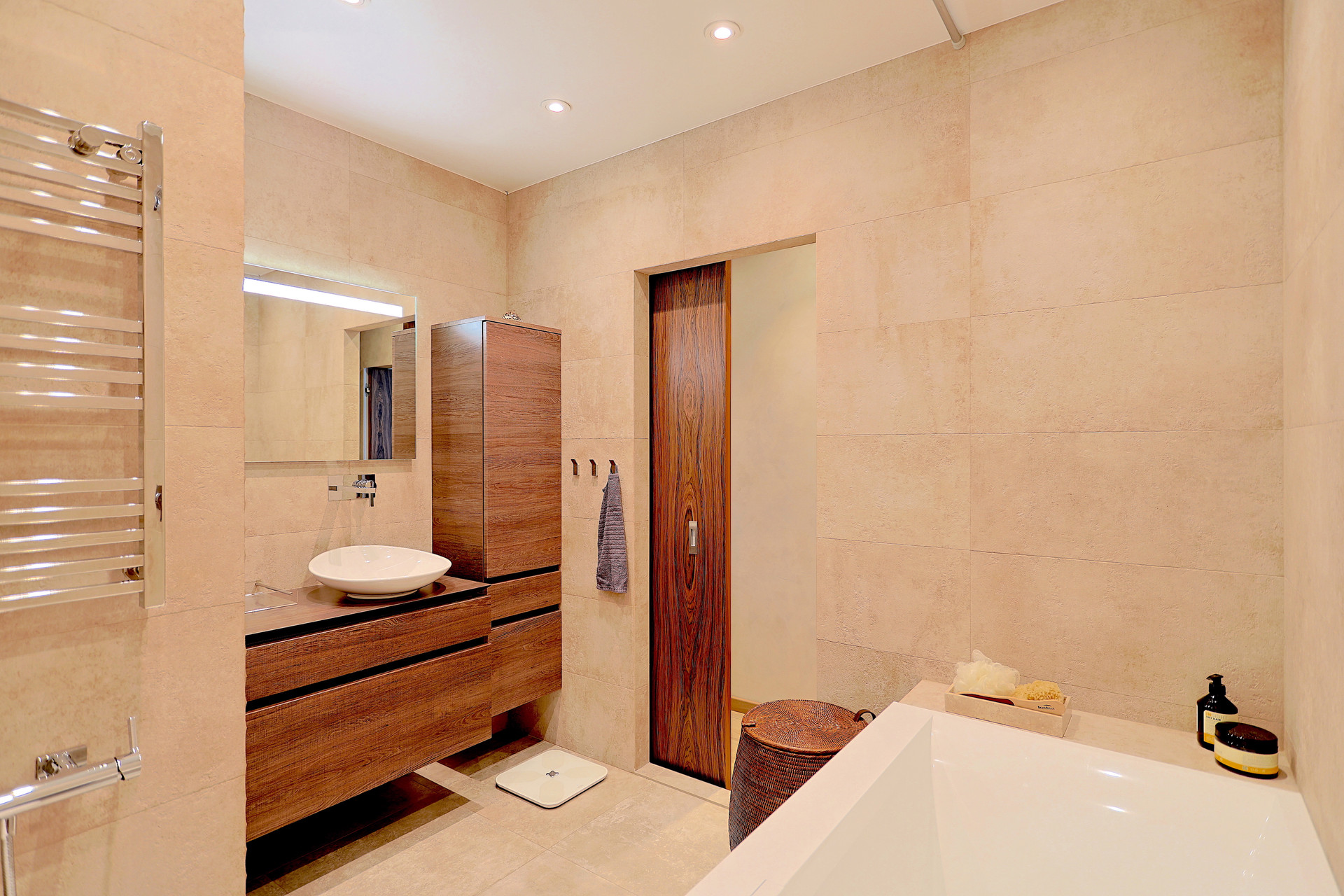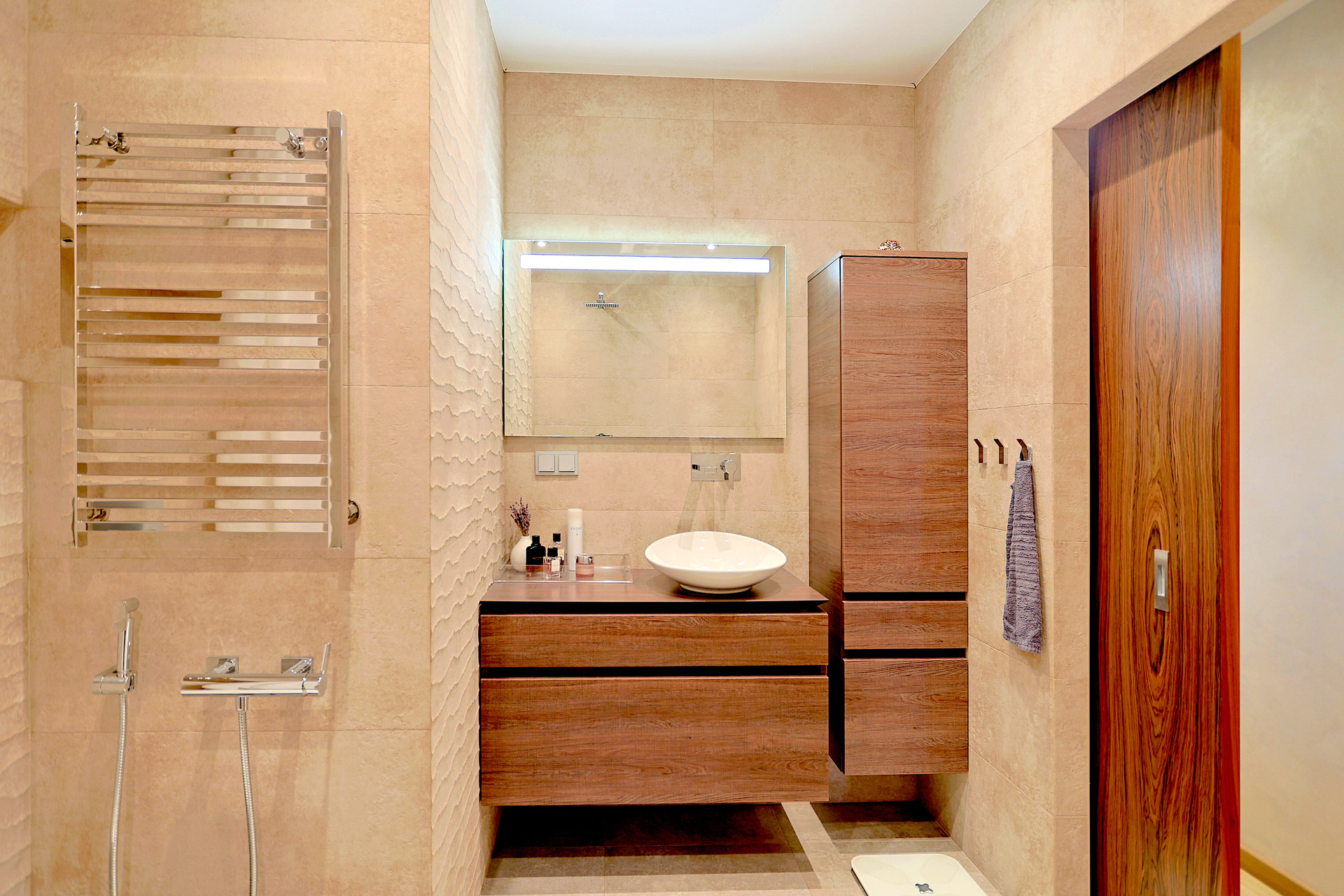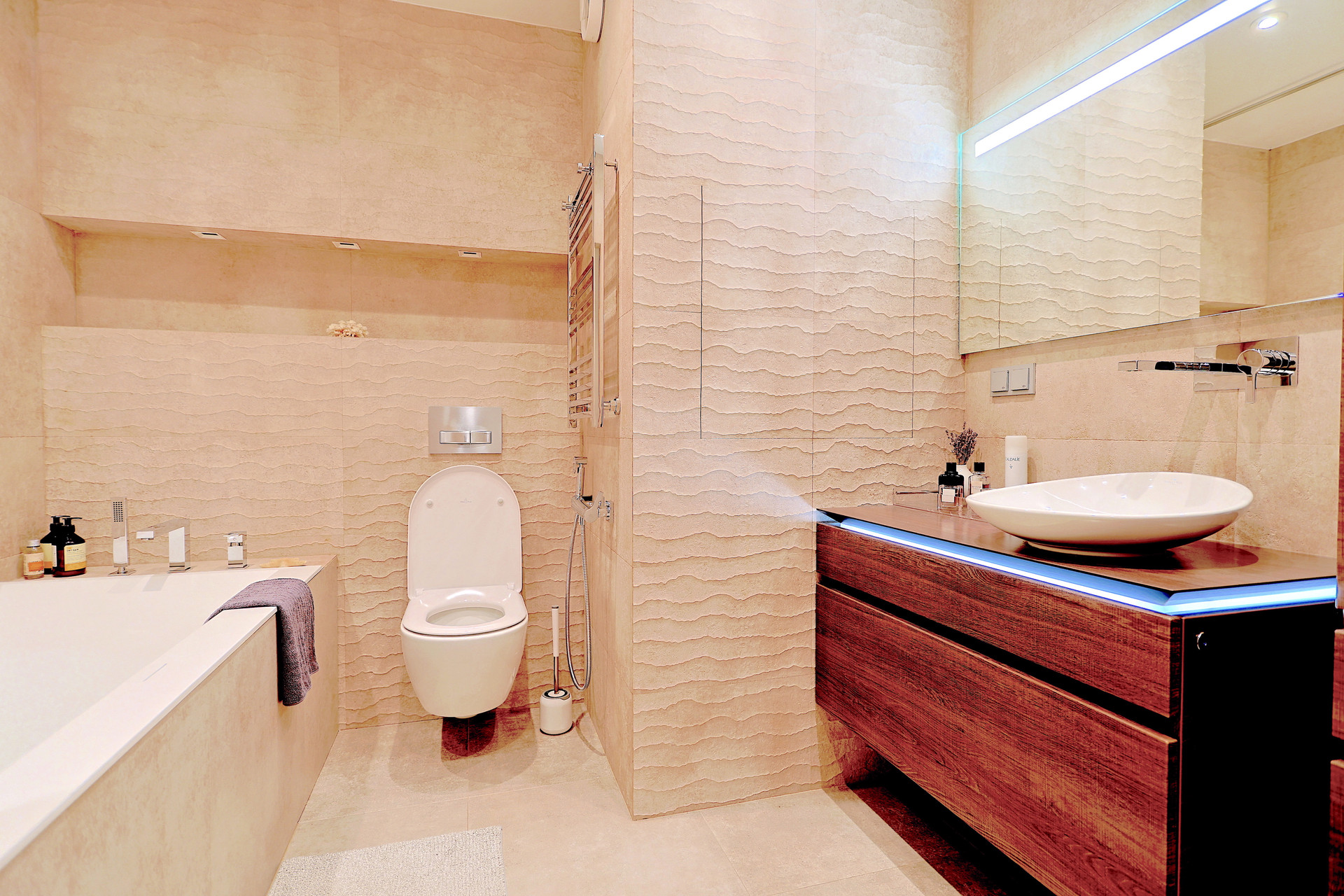 Мебель и сантехника премиальных брендов: Villeroy Boch (вся мебель, раковина, унитаз, ванная). Noken (сантехника). Зеркало с подсветкой – Jacob Delafon.