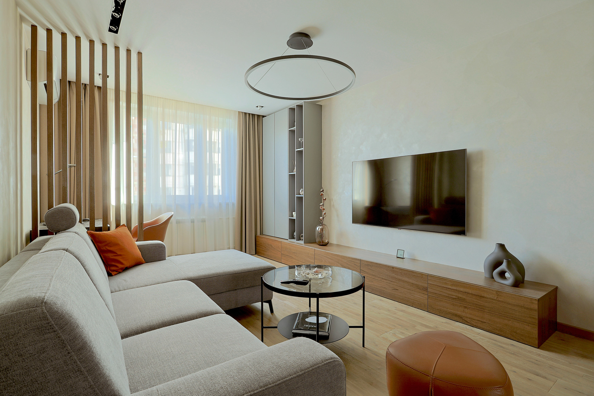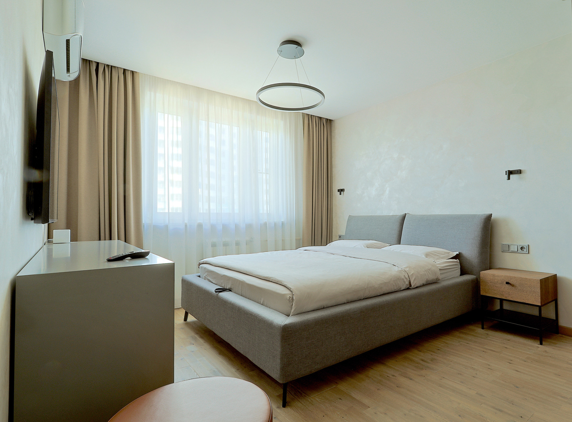 Мебель выполненная на заказ: тв-консоль, шкаф для одежды (эмаль + ЛДСП Egger, зеркала), стеклянный журнальный столик. Кондиционер Daikin дизайнерской серии.