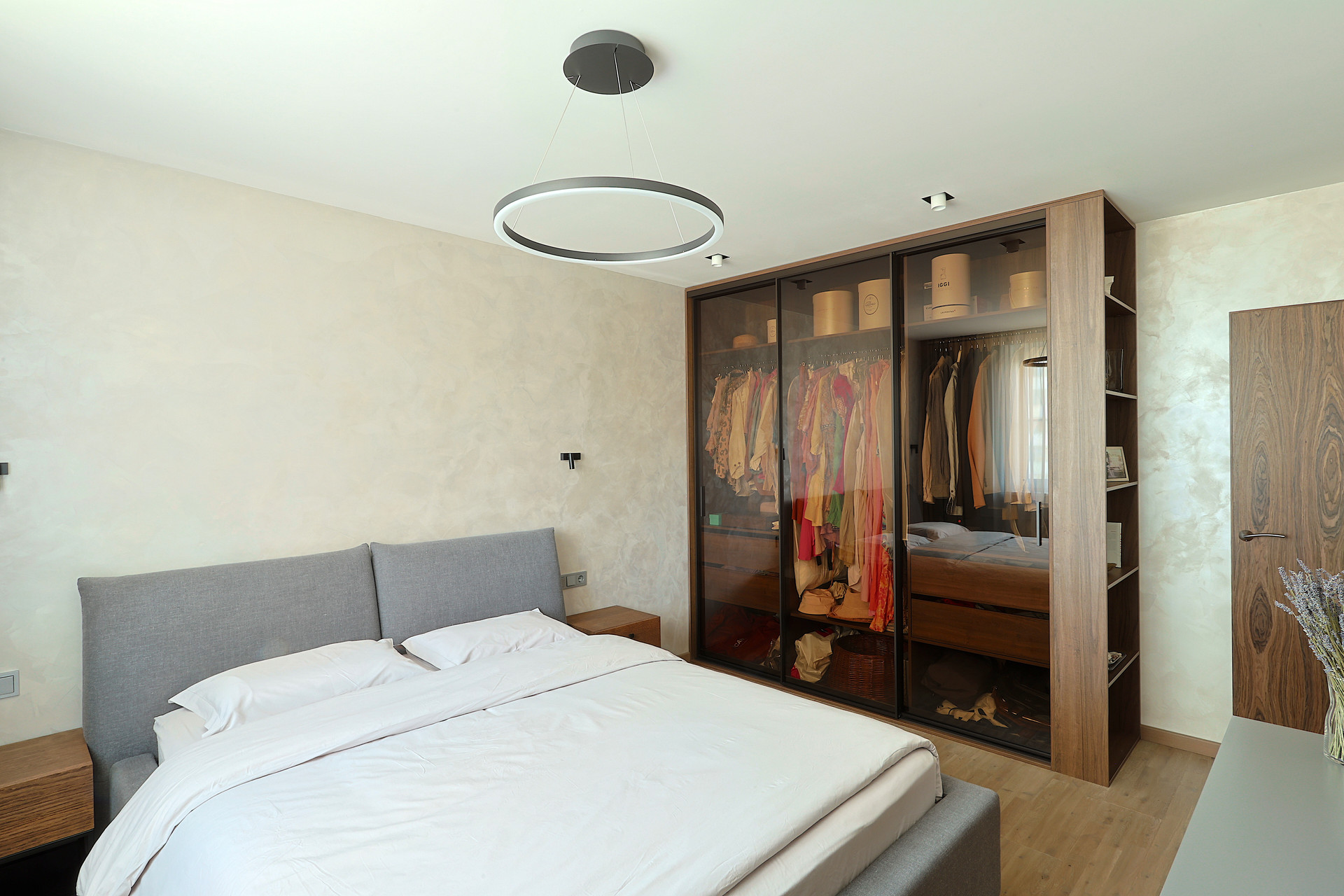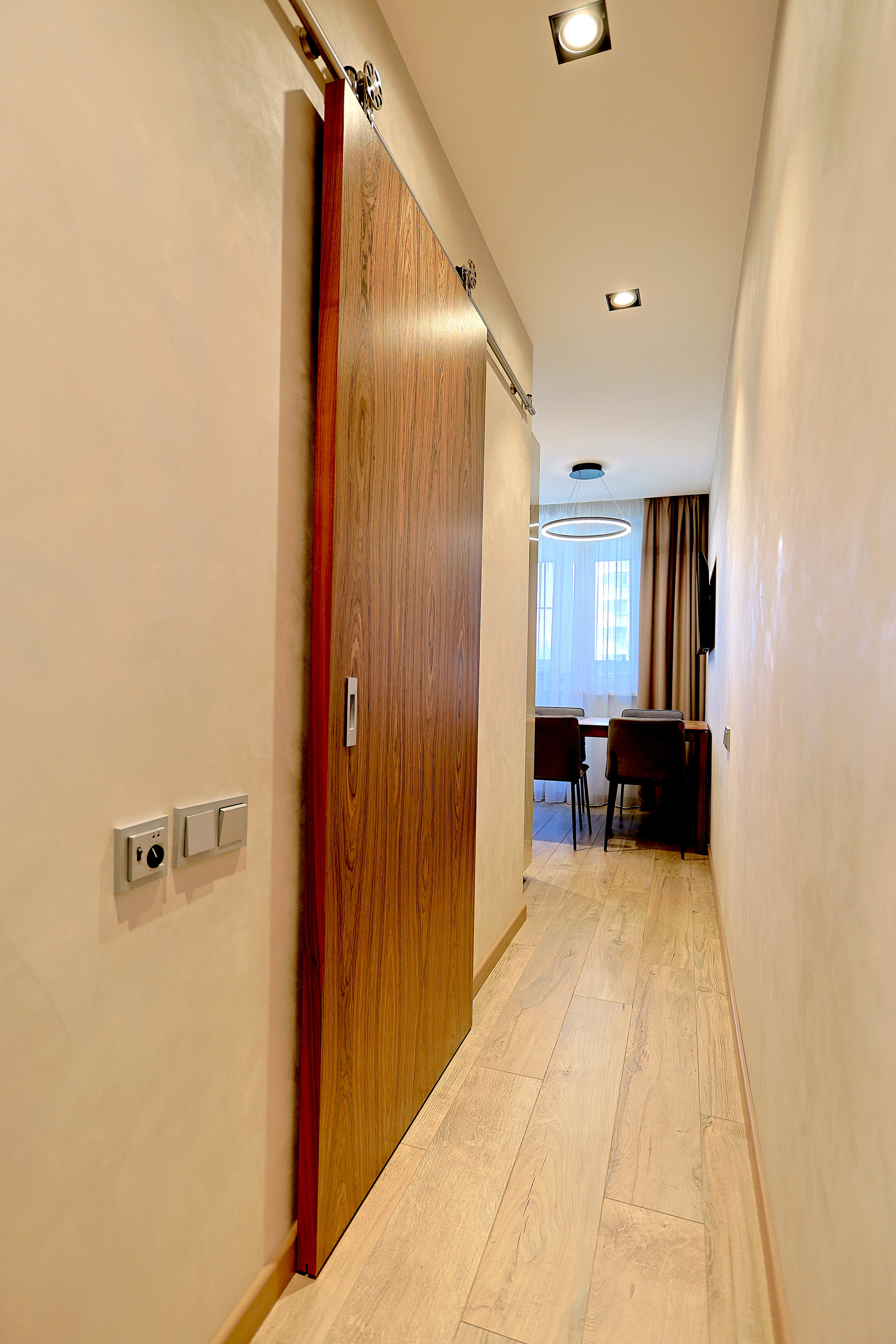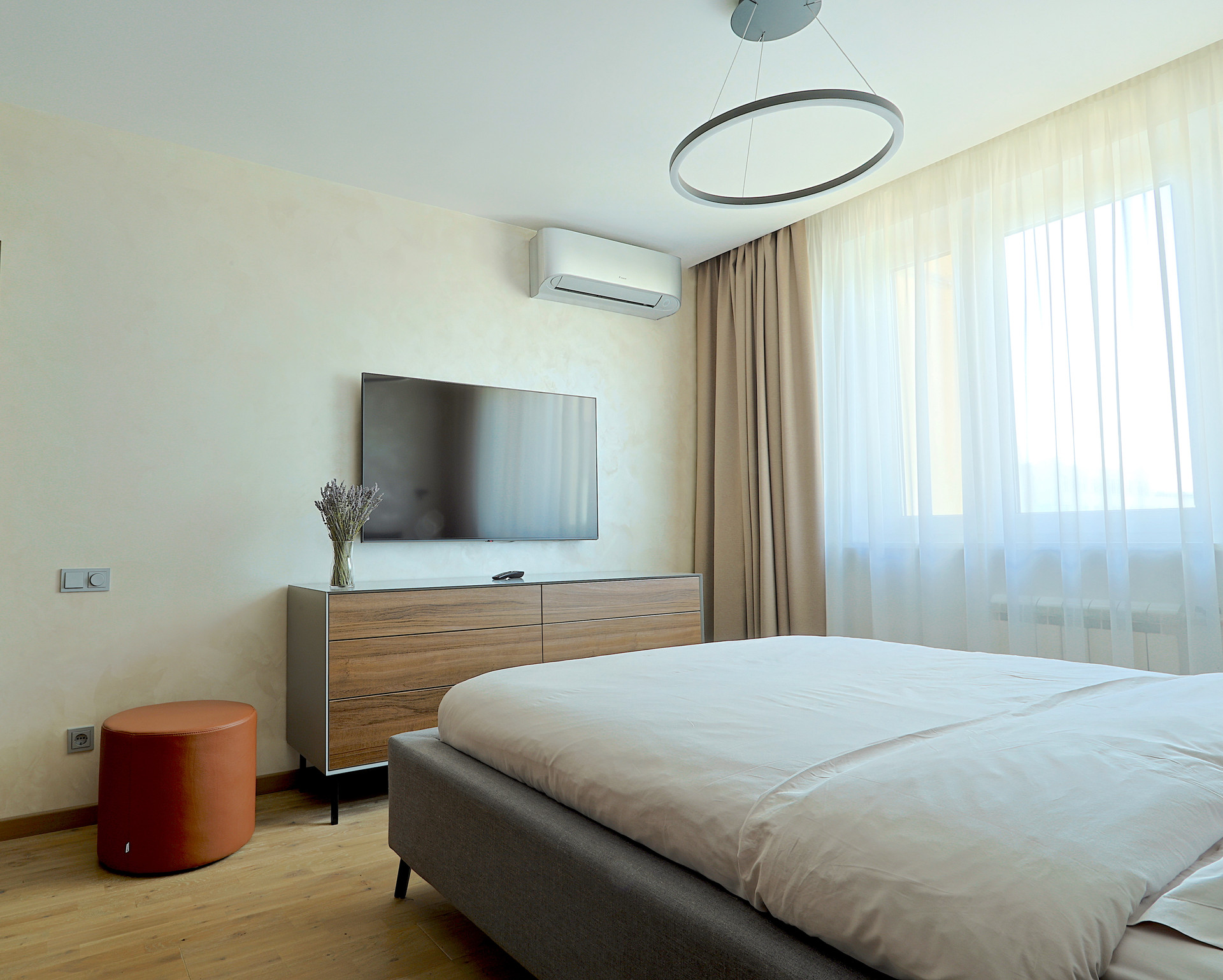 Мебель выполненная на заказ: комод (эмаль + ЛДСП Egger), встроенный шкаф-купе с раздвижной системой Raumplus (Германия). Кондиционер Daikin дизайнерской серии.