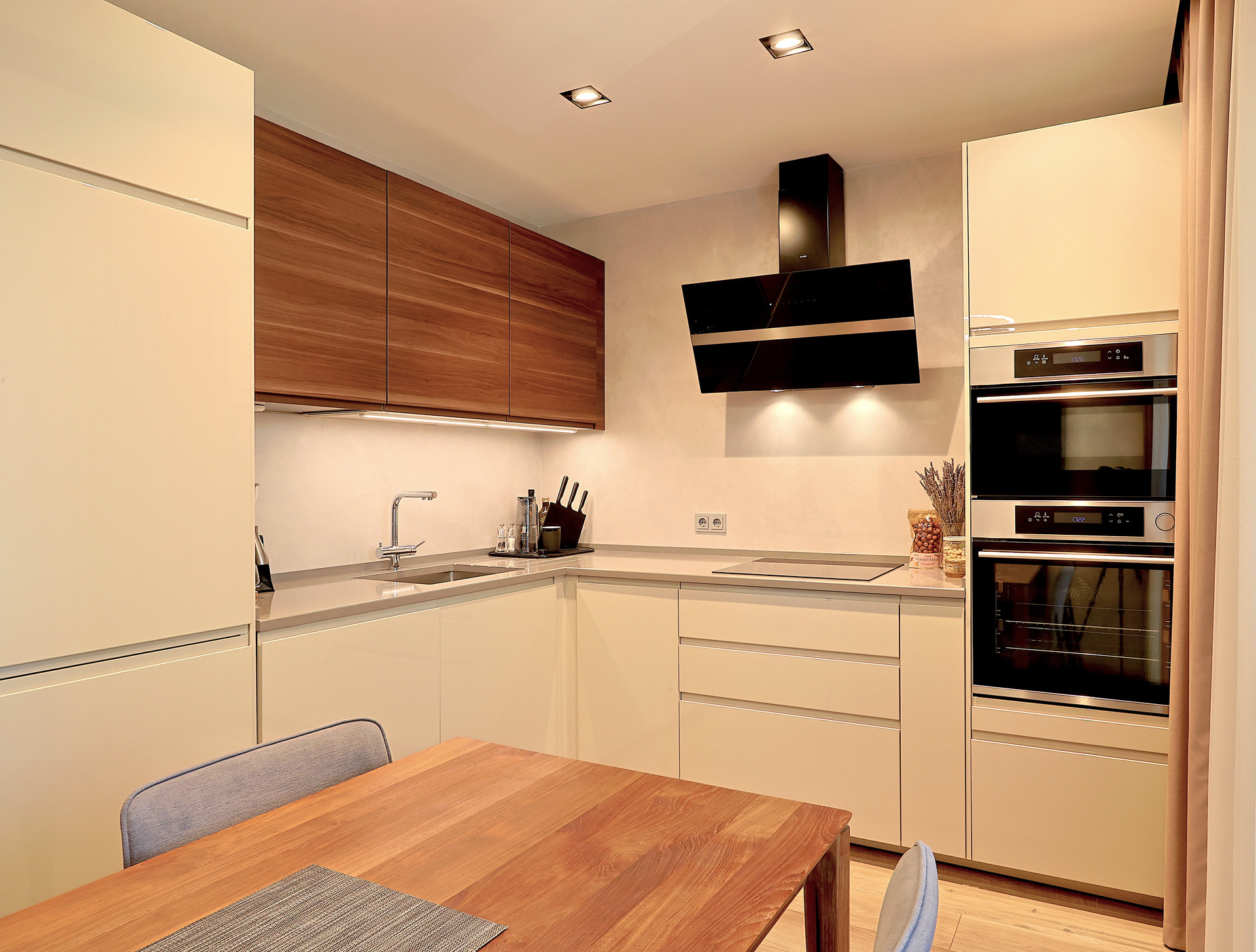 Столешница из кварца. Встроенная техника: индукционная плита, посудомоечная машина, духовой шкаф с функцией пара, СВЧ с функцией духового шкафа, холодильник с морозильной камерой Nofrost, стиральная машина. Вытяжка – Asko. На мойке установлен смеситель Blanco с двойным изливом (фильтр + проточная).
