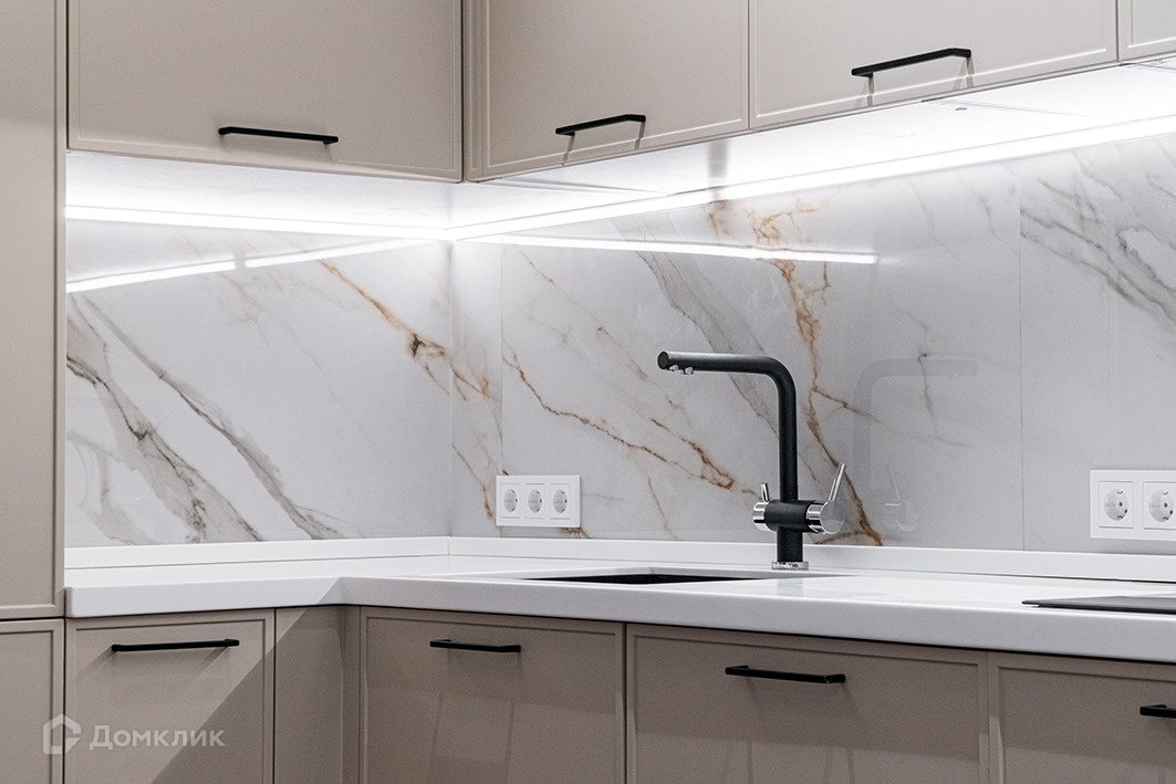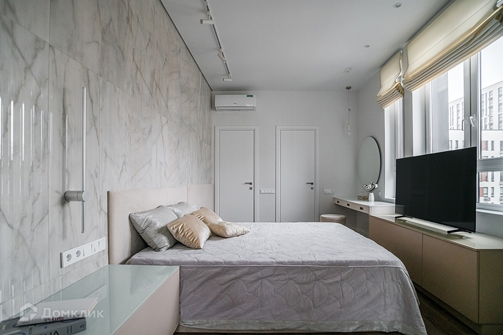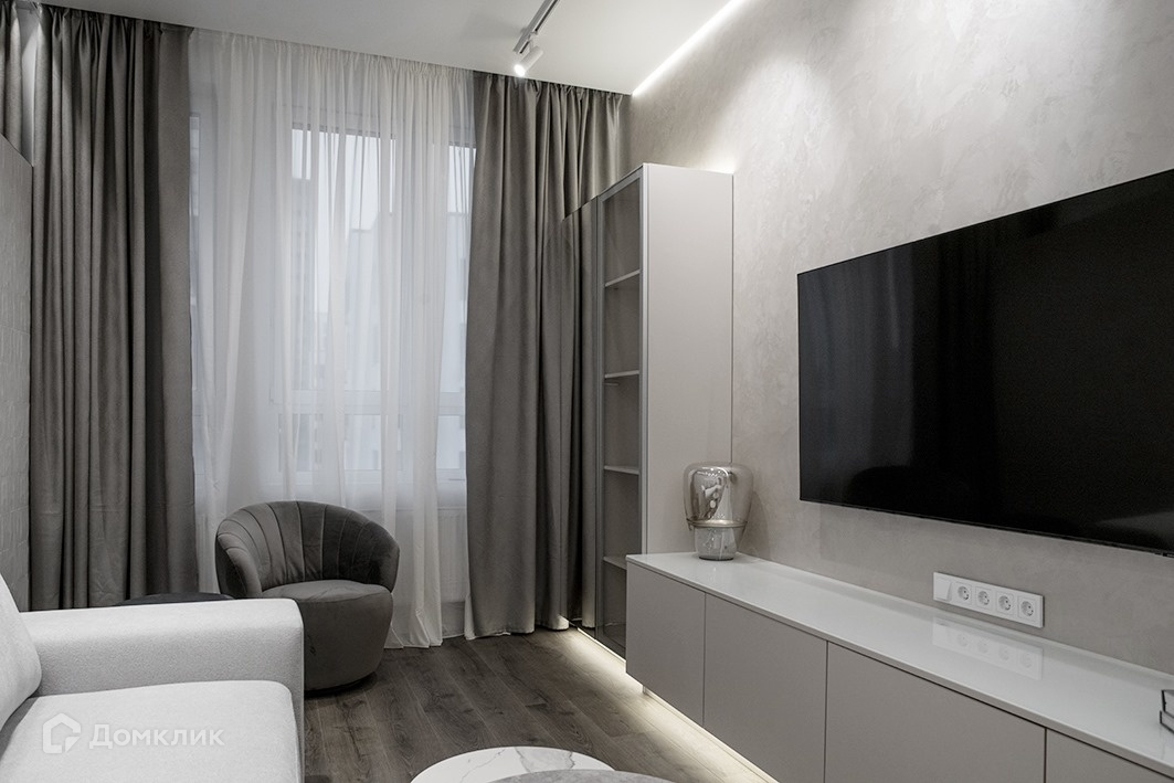Полы выполнены из кварцвинила, стены в однотонной покраске, декоративной штукатурке и фигурного сечения керамической плитке Kerama Marazzi. Потолки натяжные, двери ProfilDoors высотой 2,3 м в металлической окантовке. Сантехприборы GROHE. Кухня и другие мебельные элементы - Atlas Lux, стол - CoNcept, стулья, диваны и журнальные столики - Dantone Home, матрасы MATERLUX, бытовая техника Korting и Hyundai, кондиционеры Hisense, 3 телевизора Samsung.