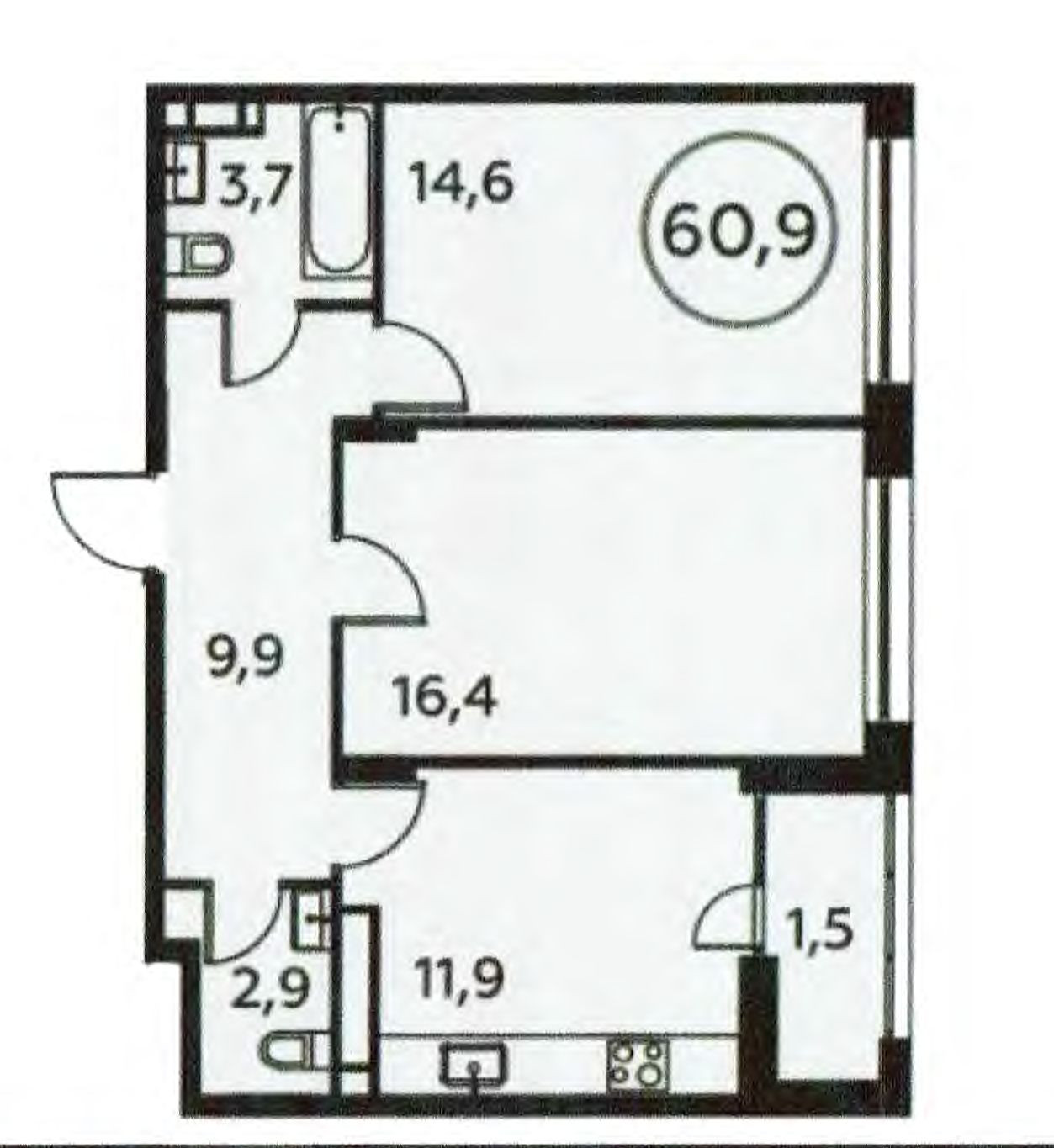 Общая площадь 59,5 м2.  Комнаты (14,6+16,4 м2).  Кухня 11,9 м2.