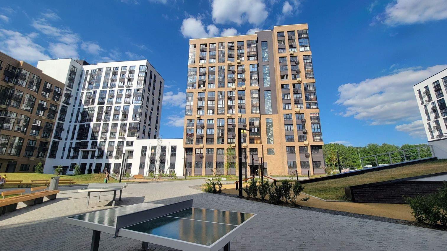 Территория ЖК огорожена, оборудована местами для отдыха, детскими и спорт. площадками.  Ландшафтный дизайн пешеходных зон. Концепция- "двор без машин". Развитая инфраструктура: магазины, кафе, салоны красоты, фитнес центры, детский сад, школа.