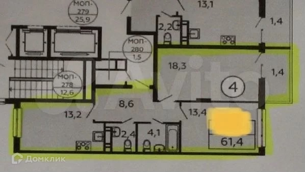 Жилая площадь 61 м2