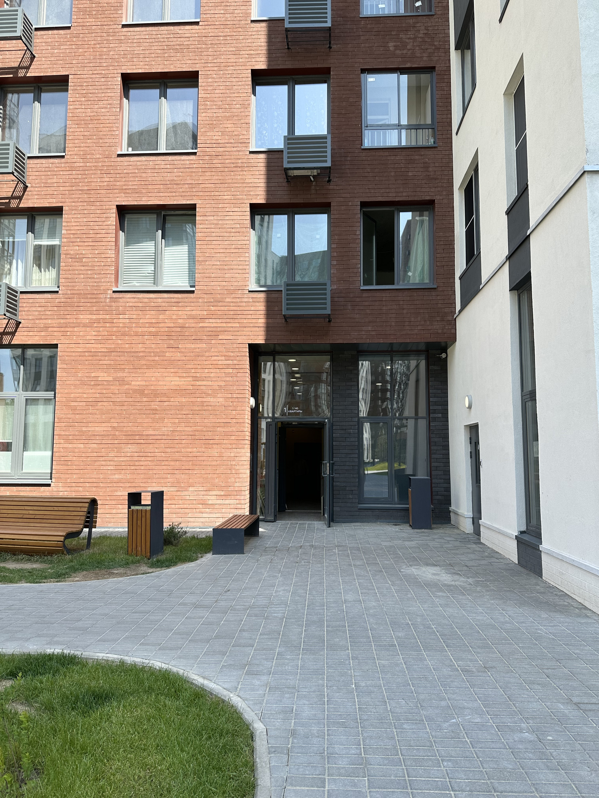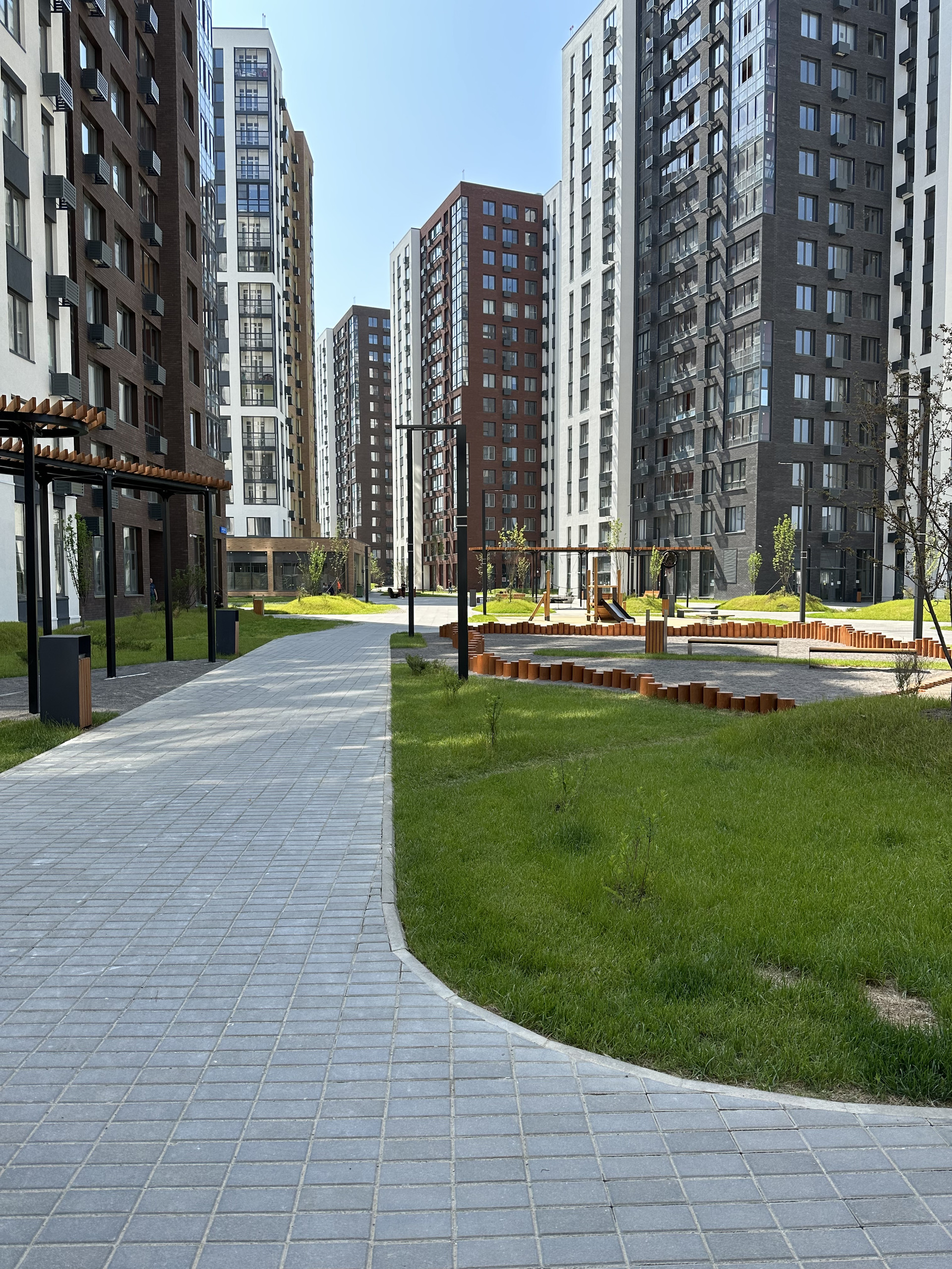 Двор-парк с детской площадкой без машин, ухоженная, новая, чистая территория.