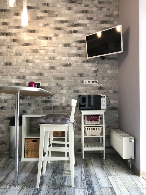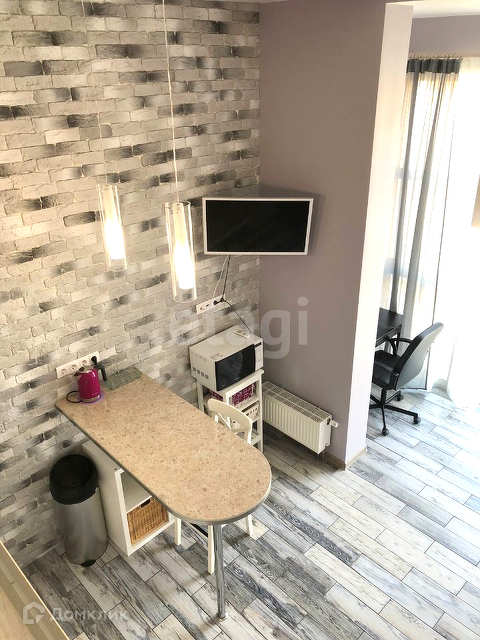 Квартира полностью меблирована и оснащена всей необходимой техникой: встроенная кухня, варочная панель, микроволновка, холодильник, телевизор, шкаф, обеденная зона, компьютеный стол, кровать.