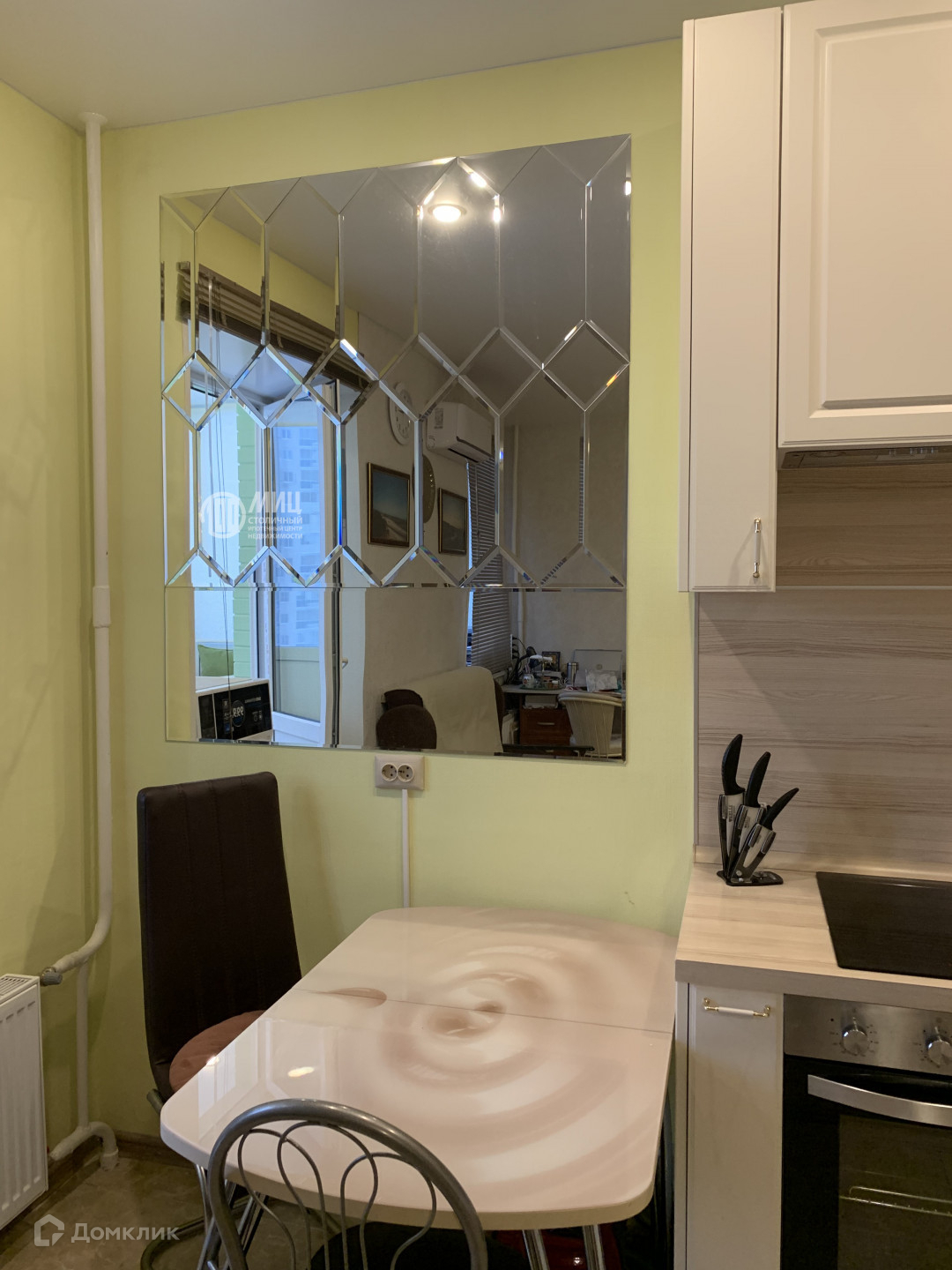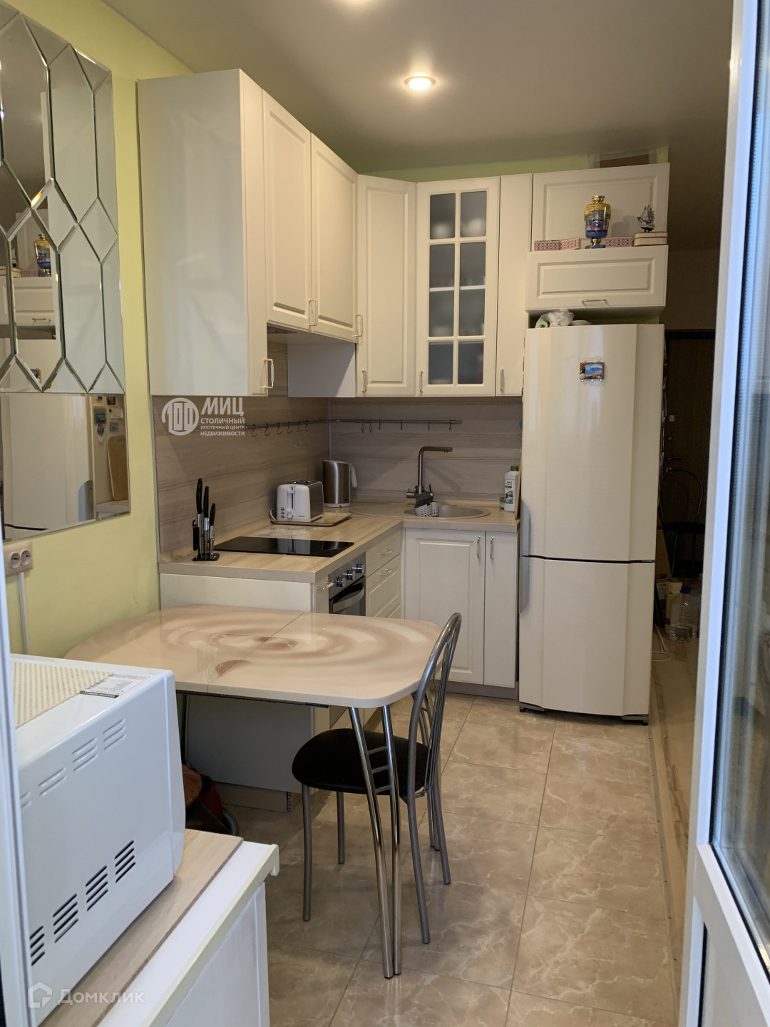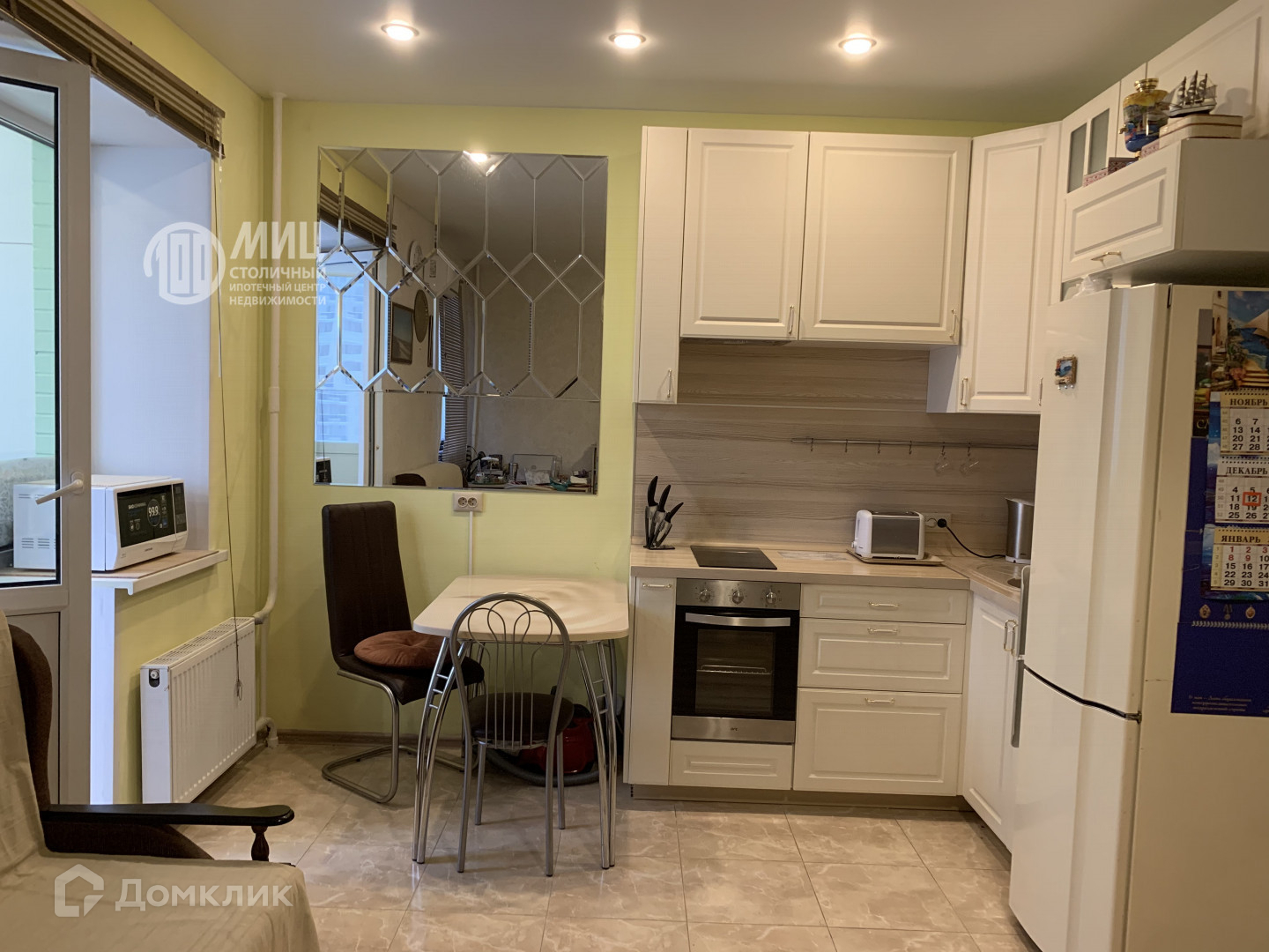 Кухонный гарнитур со встроенной техникой. Застеклённая лоджия, на которой расположен шкаф и кресло, как дополнительная зона отдыха!