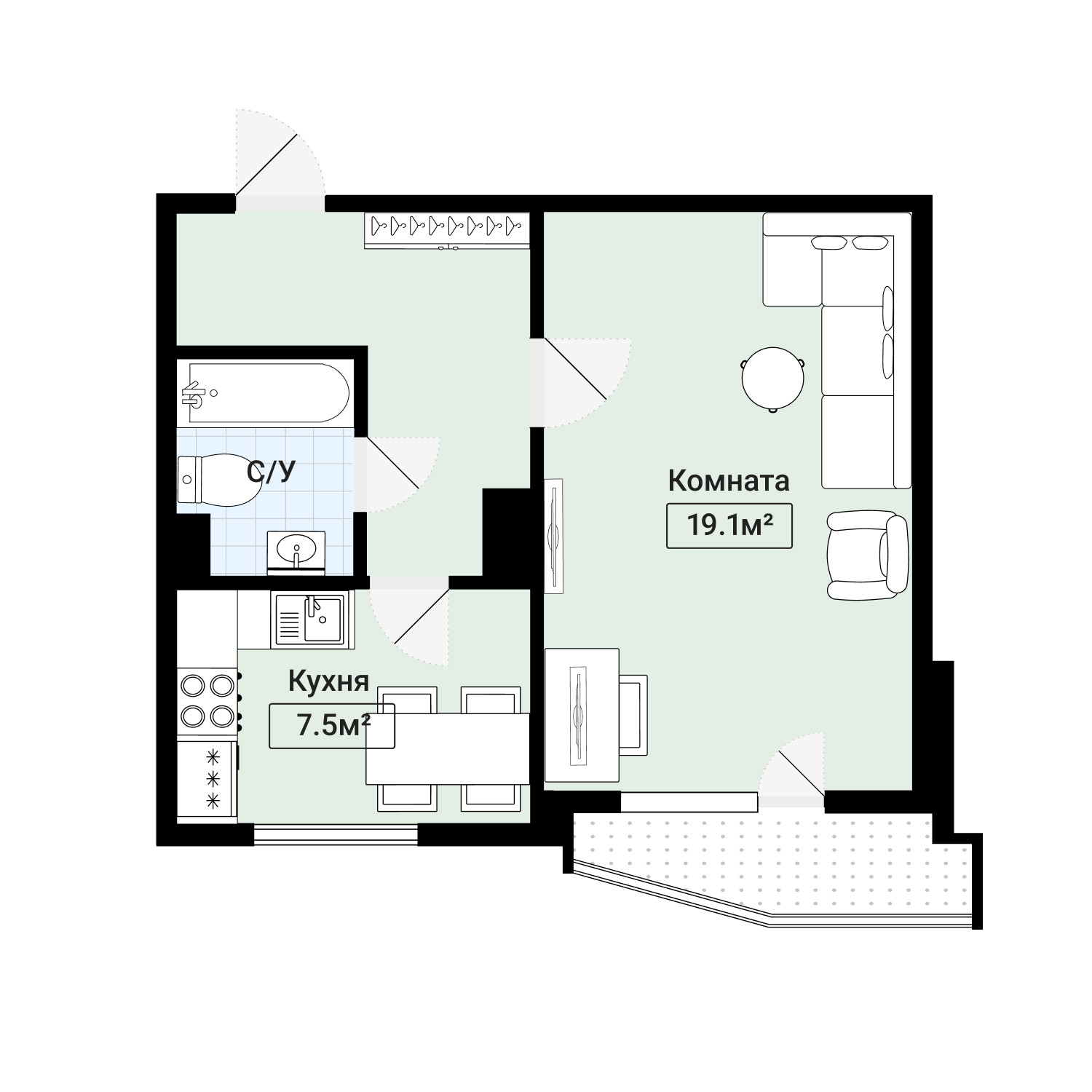 Жилая площадь 19.1 м2