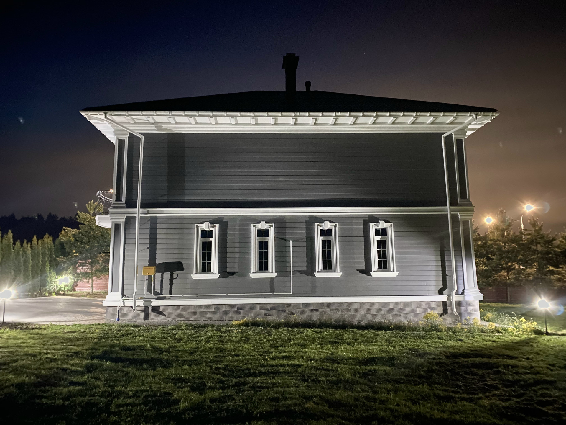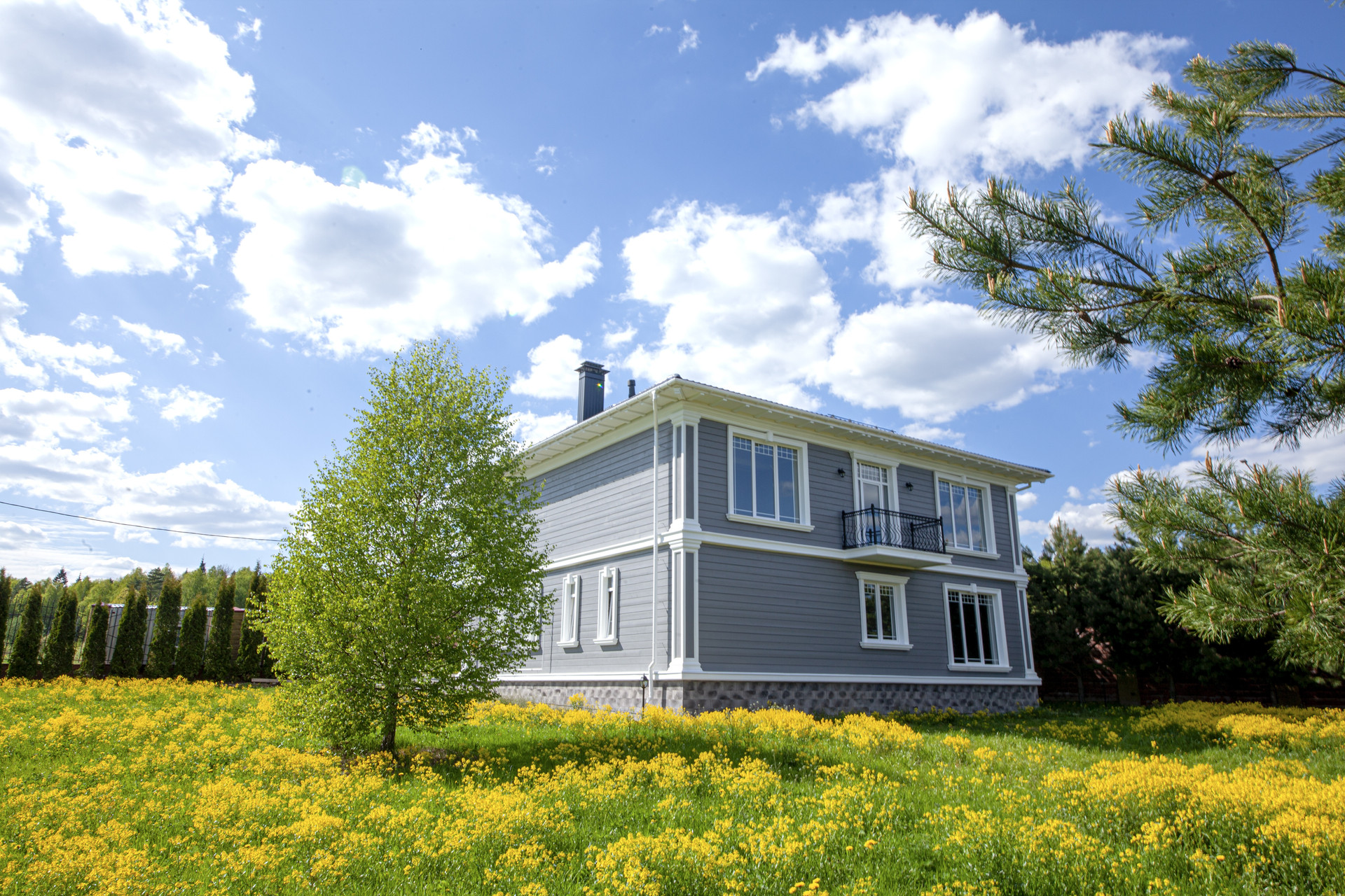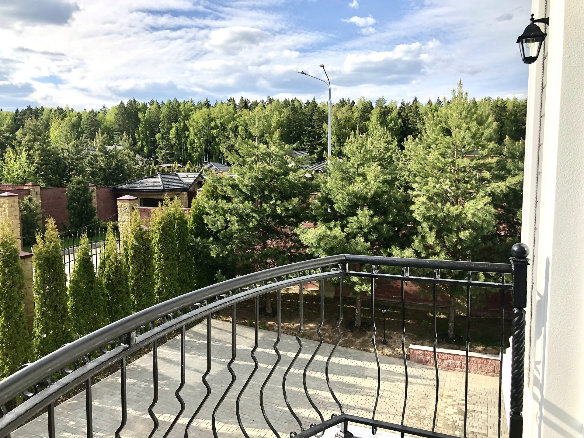Участок благоустроен: по периметру выложен забор из декоративных блоков с коваными пролетами. Для въезда на участок установлены откатные ворота. Вдоль забора высажены 5-ти метровые сосны и туи, есть освещение и паркинг.