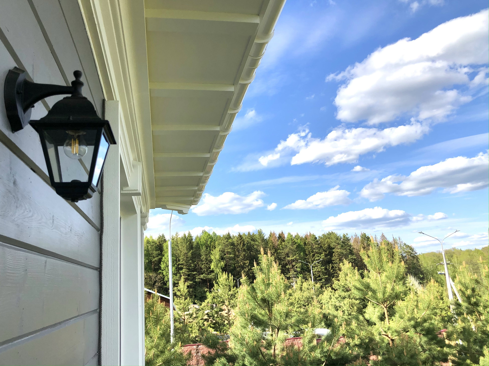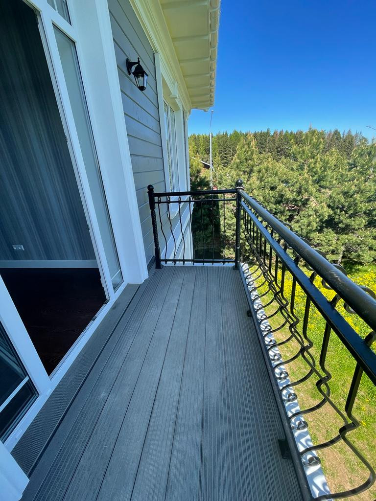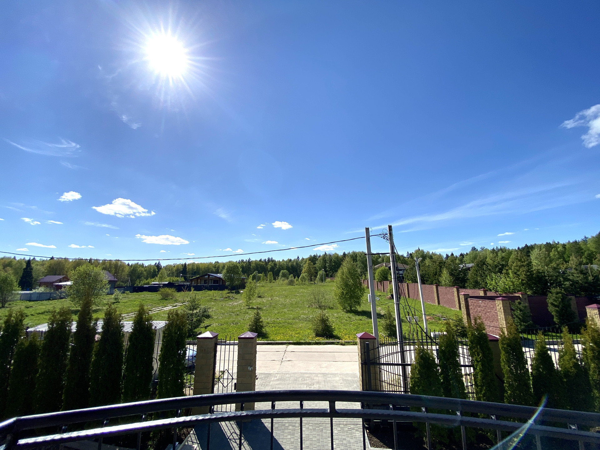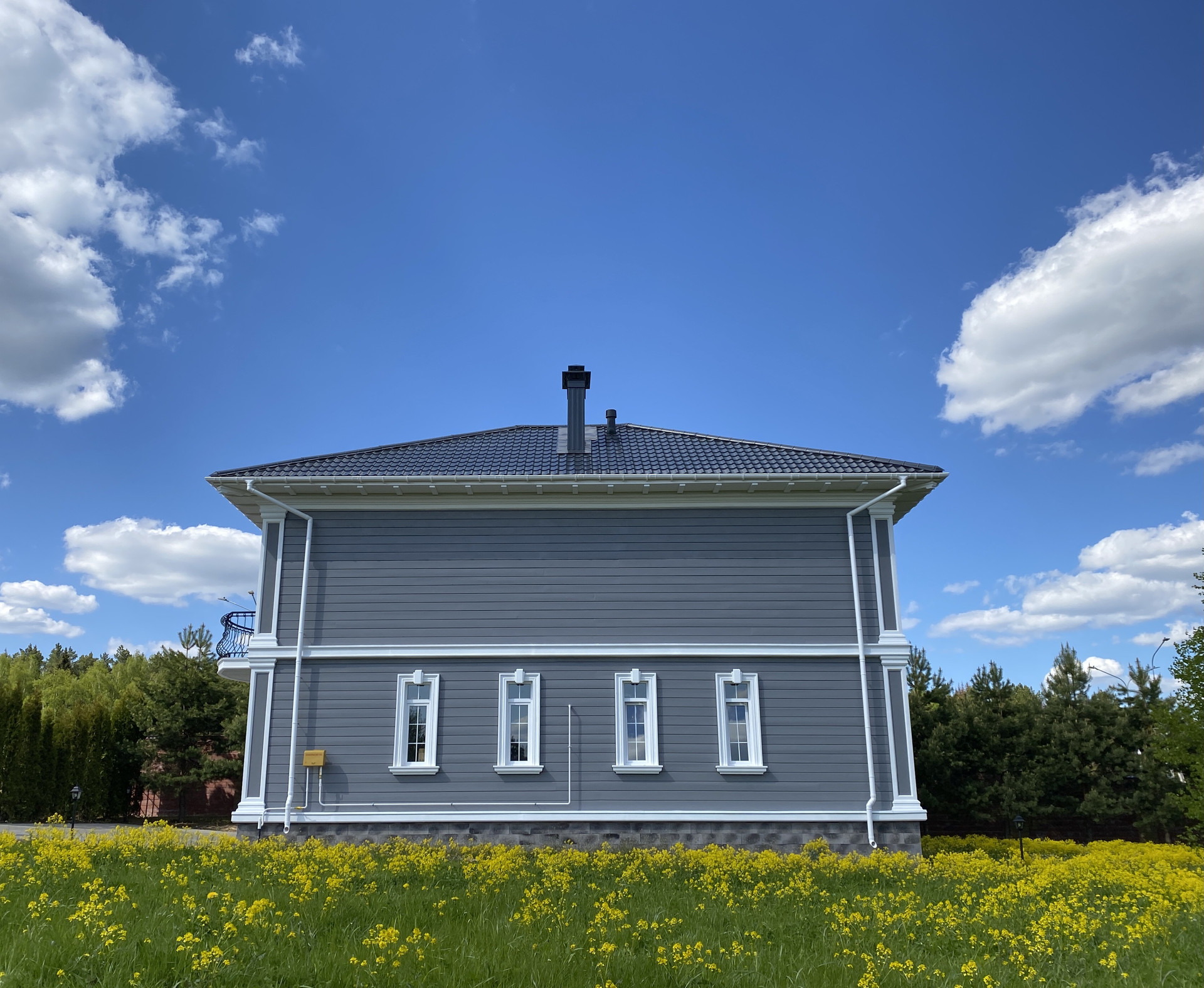 Участок благоустроен: по периметру выложен забор из декоративных блоков с коваными пролетами. Для въезда на участок установлены откатные ворота. Вдоль забора высажены 5-ти метровые сосны и туи, есть освещение и паркинг.