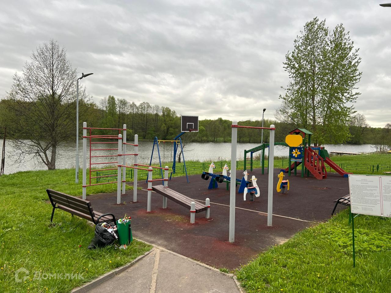 - на территории поселка, детская зона, качели, песочница, горки, пляж