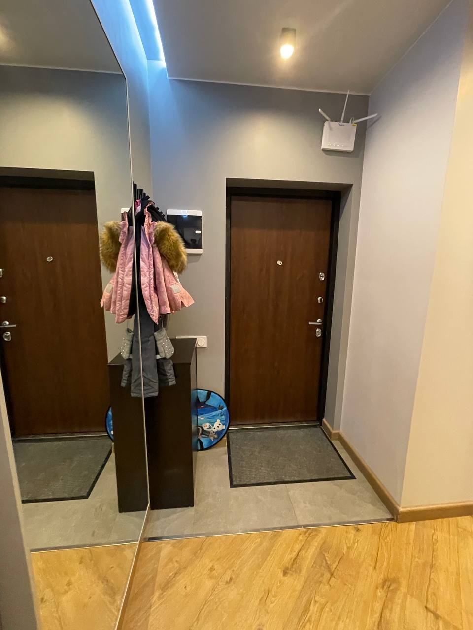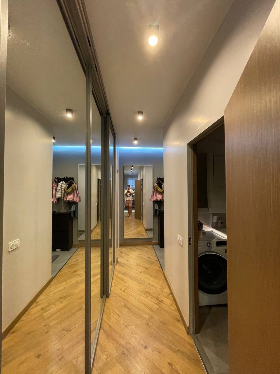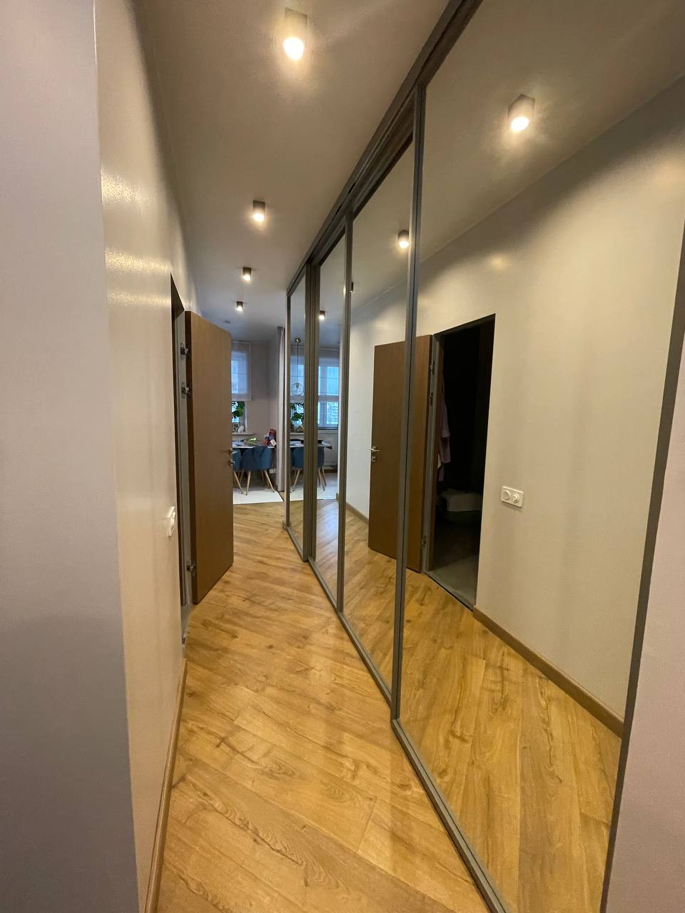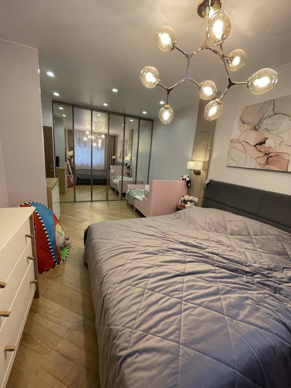 В комнатах современные трубчатые радиаторы скрытого монтажа с возможность редактировать температуру. Есть два больших зеркальных шкафа, которые вмонтированы в ниши.  Стены покрашены английской краской little green. В ванной комнате есть ванная и отдельный душ.