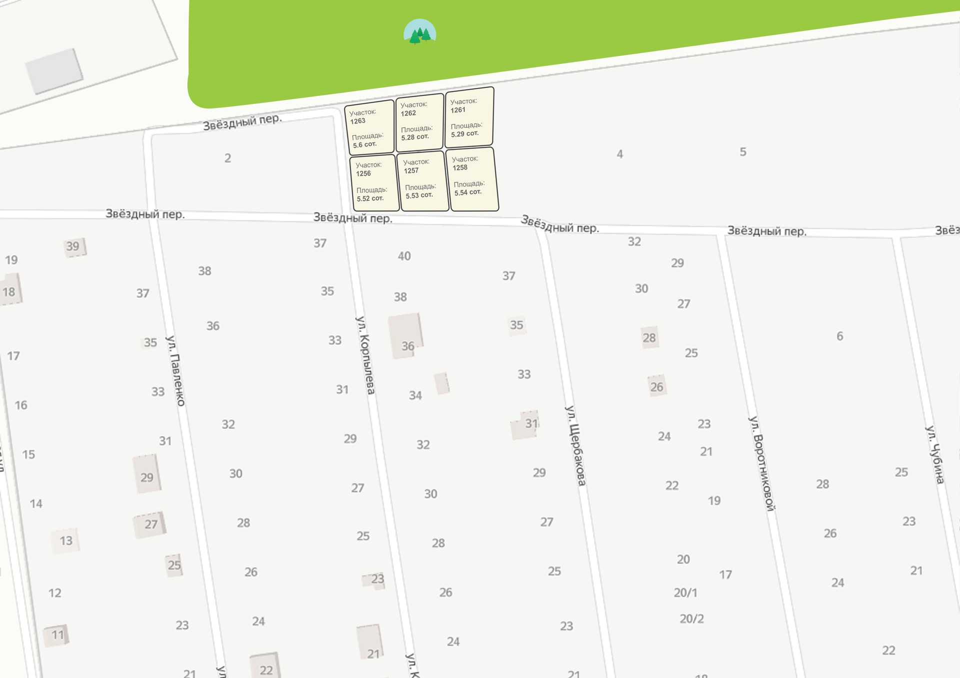 В районе 6 земельных участков площадью от 5,3 до 6 сот.