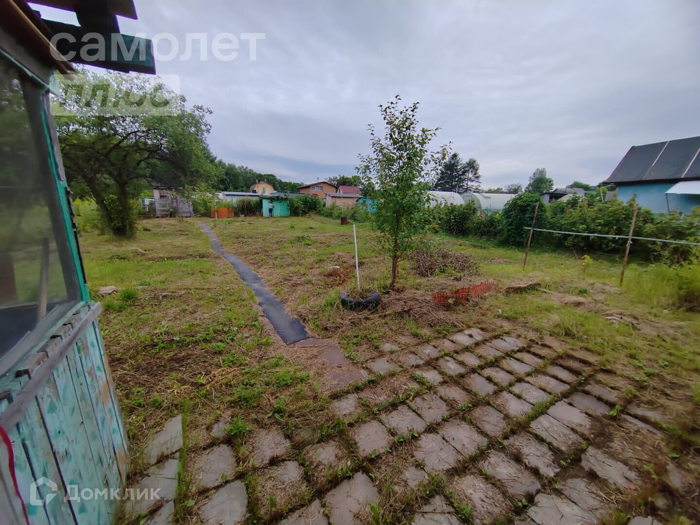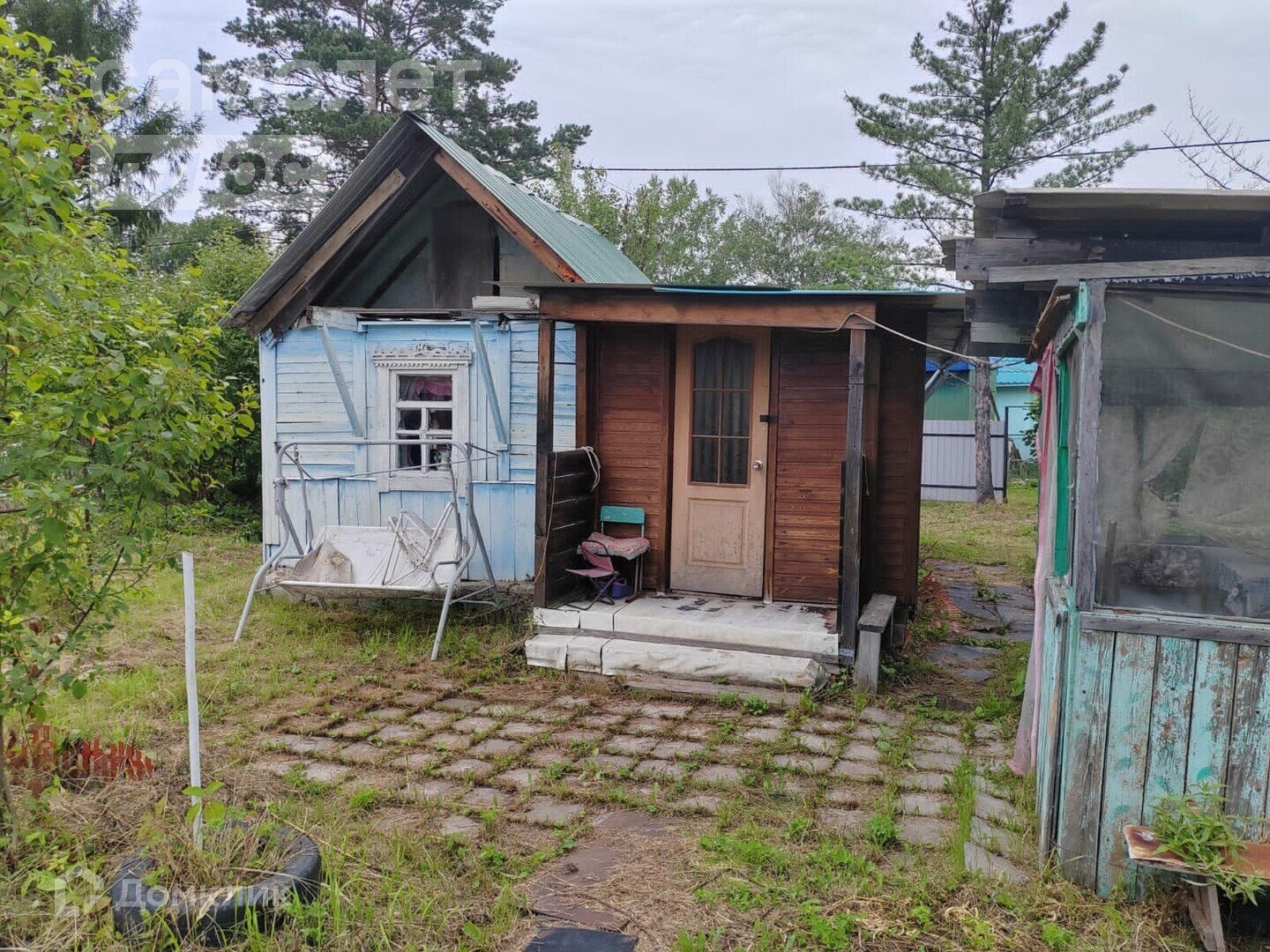 - Возле дома выложена плитка.