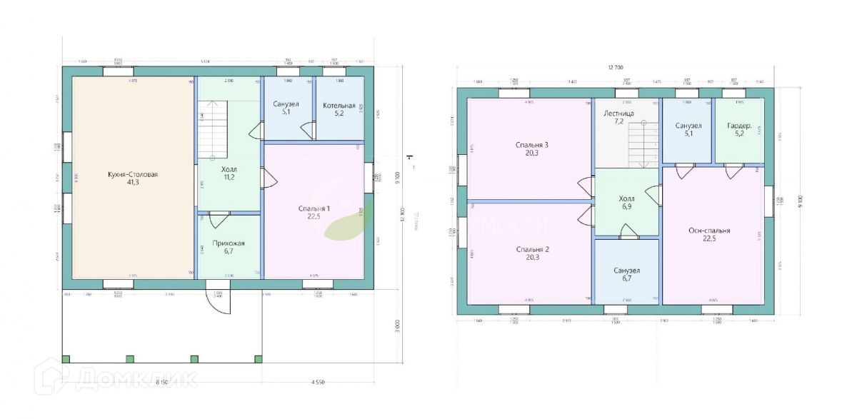 На 1 этаже дома расположены: прихожая 6,7 кв.м., холл с лестницей на второй этаж 11,2 кв.м., котельная 5,2 кв.м., санузел 5,1 кв.м., кухня-столовая 41,3 кв.м., комната 22,5 кв.м.; на 2 этаже – три изолированные комнаты 20,3/20,3/22,5 кв.м., в большой комнате свой сан.узел 5,1 кв.м. и гардеробная 5,2 кв.м., общий санузел 6,7 кв.м., холл 6,9 кв.м.