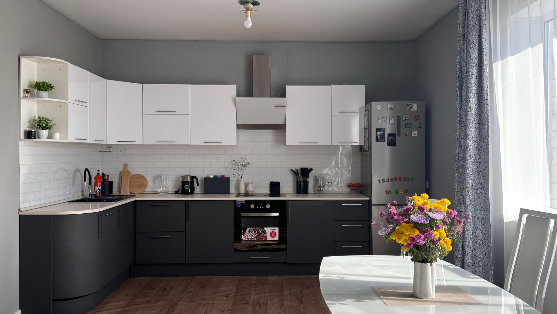 встроенная техника: индукционная варочная панель 4 конфорки фирмы Bosch, вытяжка Bosch, посудомоечная машина, духовой шкаф.