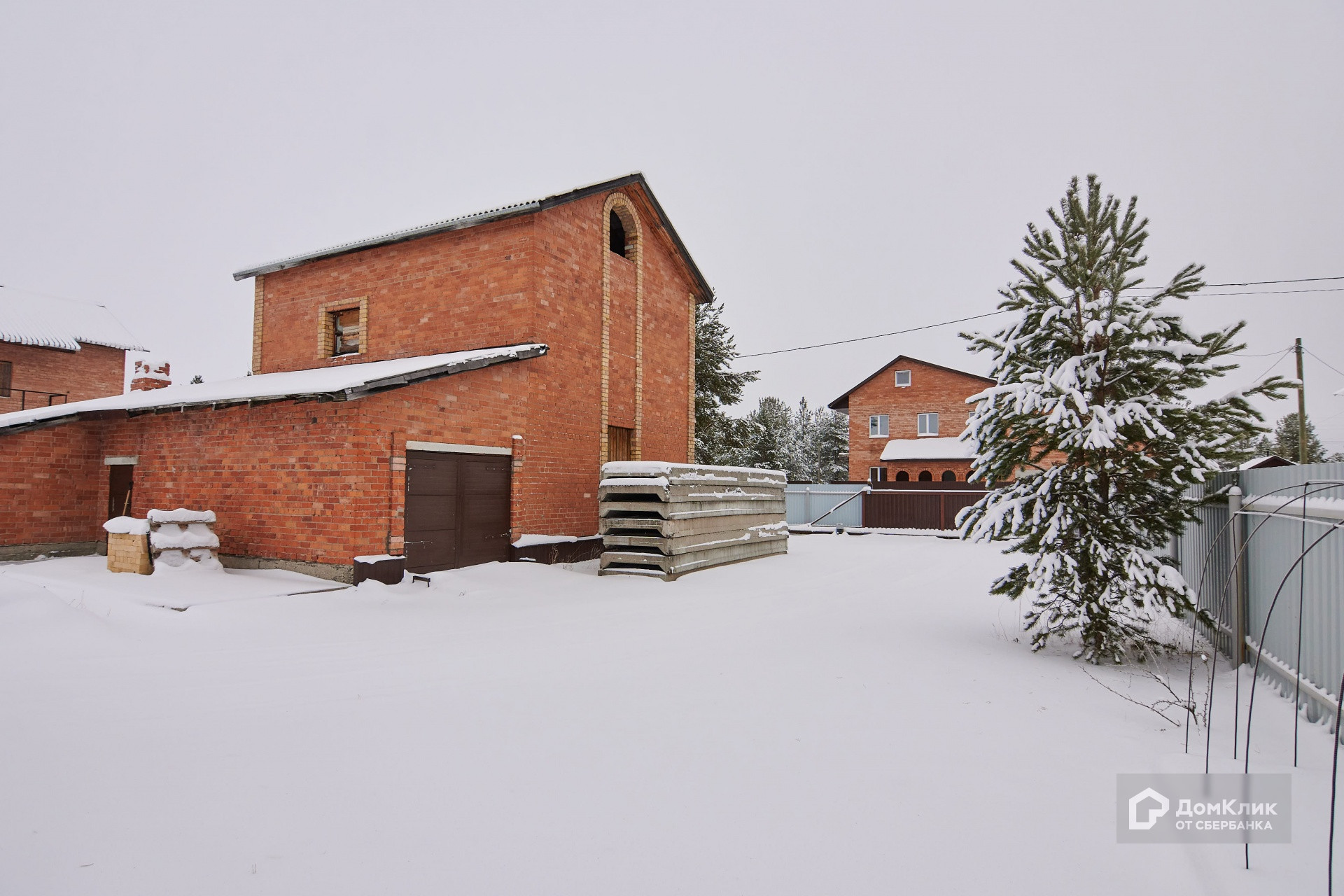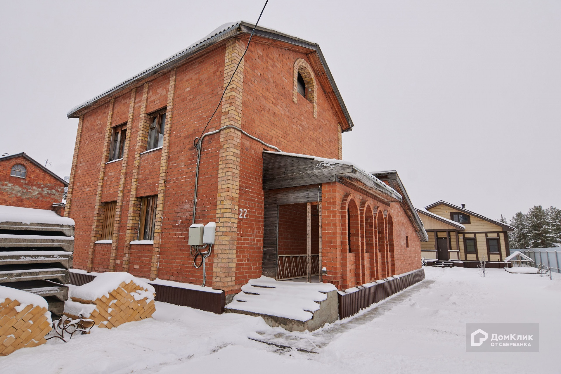 Кирпичный дом без чистовой отделки. 1й этаж: гараж, котельная, коридор с раздельным санузлом, комната, кухня-гостиная, большое крыльцо и дровяник под крышей; 2-й: 3 комнаты; 3-й: мансардный этаж над всем домом. Большой сухой погреб во весь рост в гараже. Фундамент утеплённый, с бетонной отмосткой.