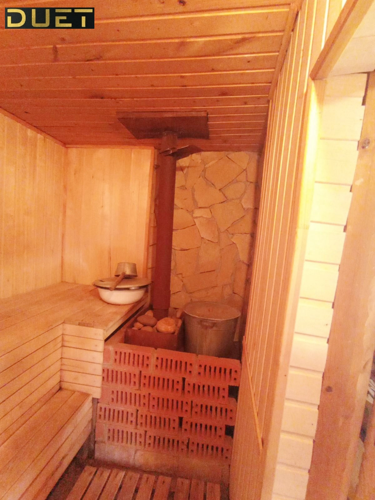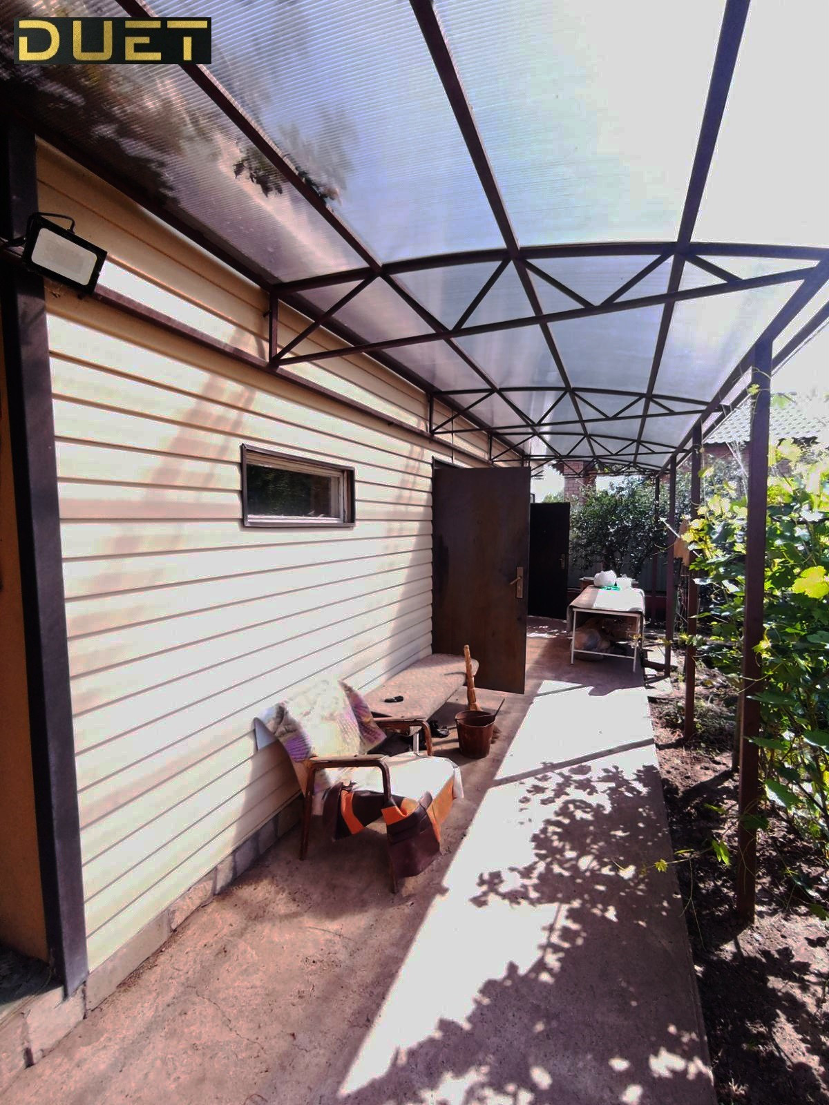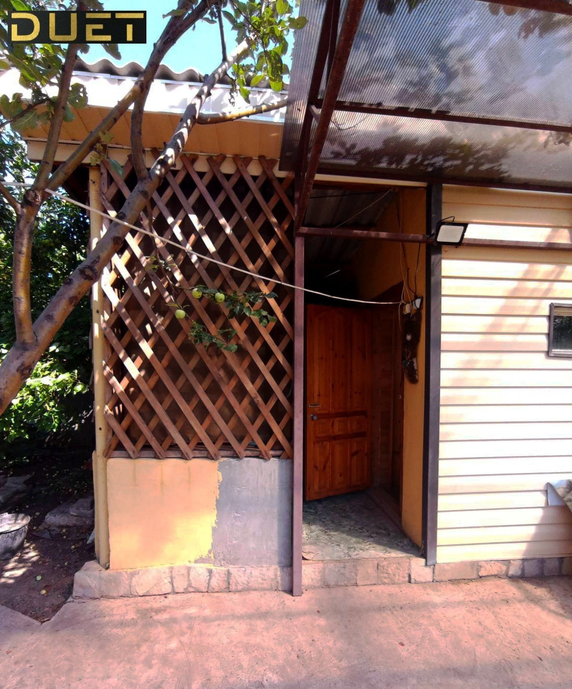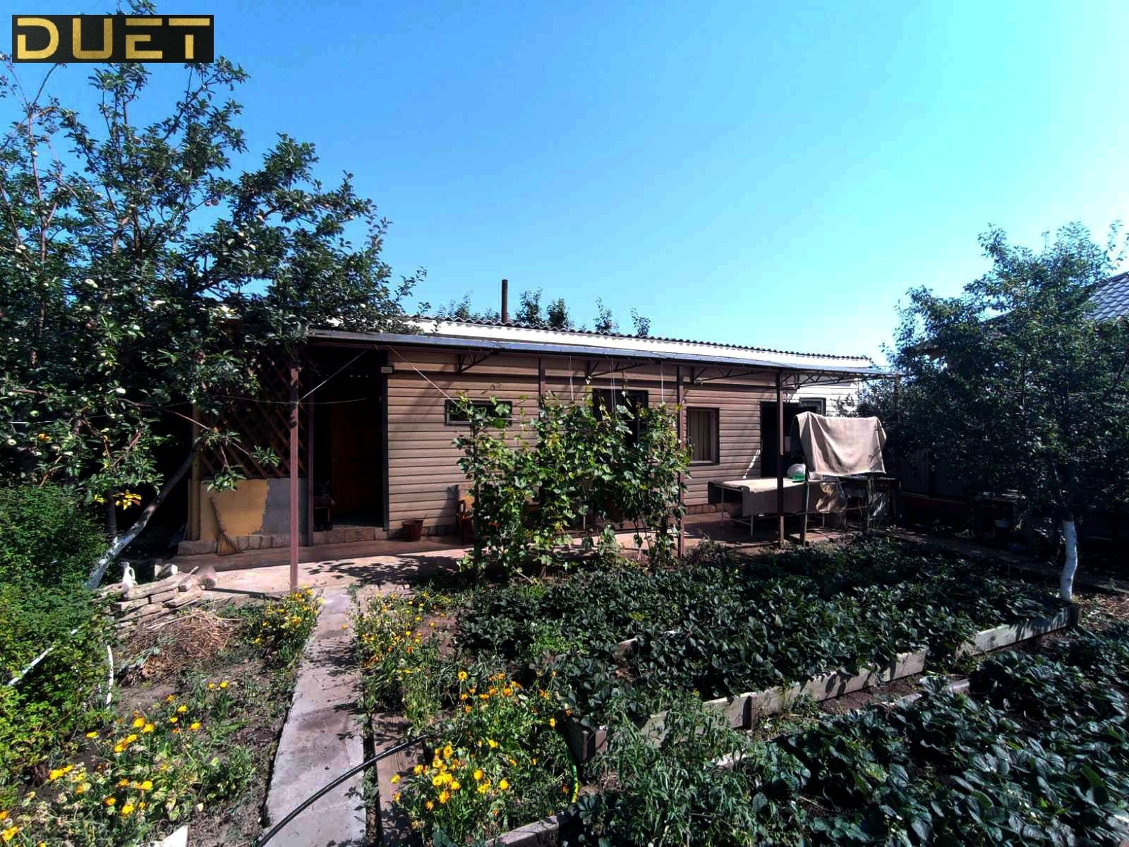 Домик построен из керамзитоблока, обшит сайдингом. В самом доме расположены кухня, спальня, баня с предбанником, летная крытая веранда. На участке так же есть туалет, летний душ.
