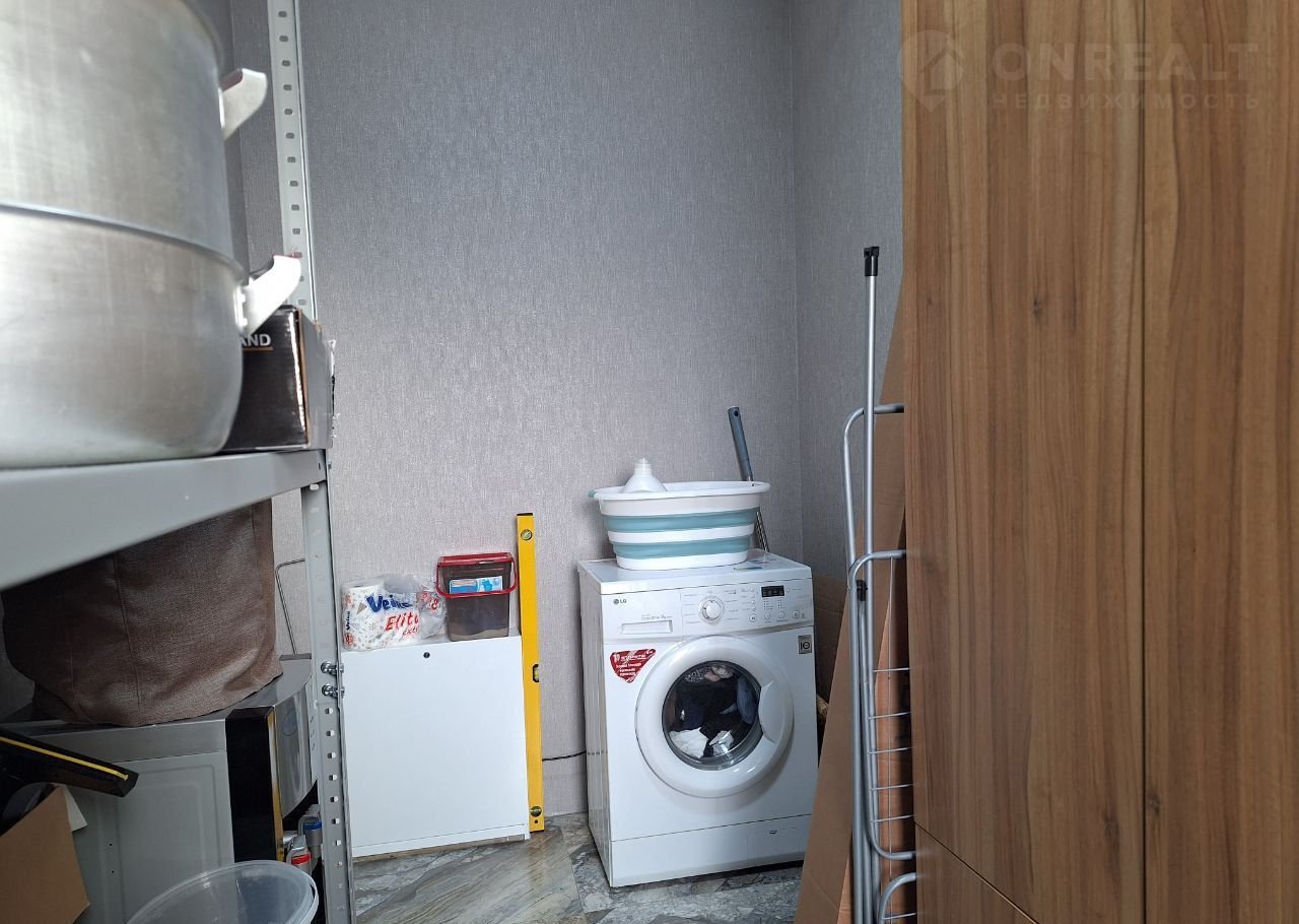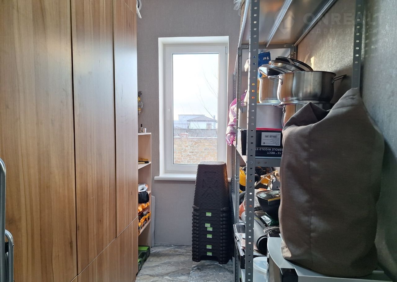 В кладовке размещены: газовый котёл, стиральная машинка, стеллажи под инструмент, шкаф для хранения.