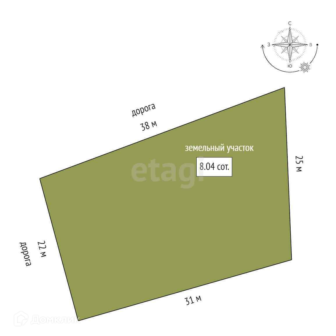 Площадь участка - 8 соток. Участок со сторонами: 22 м*38 м*25 м*31 м.